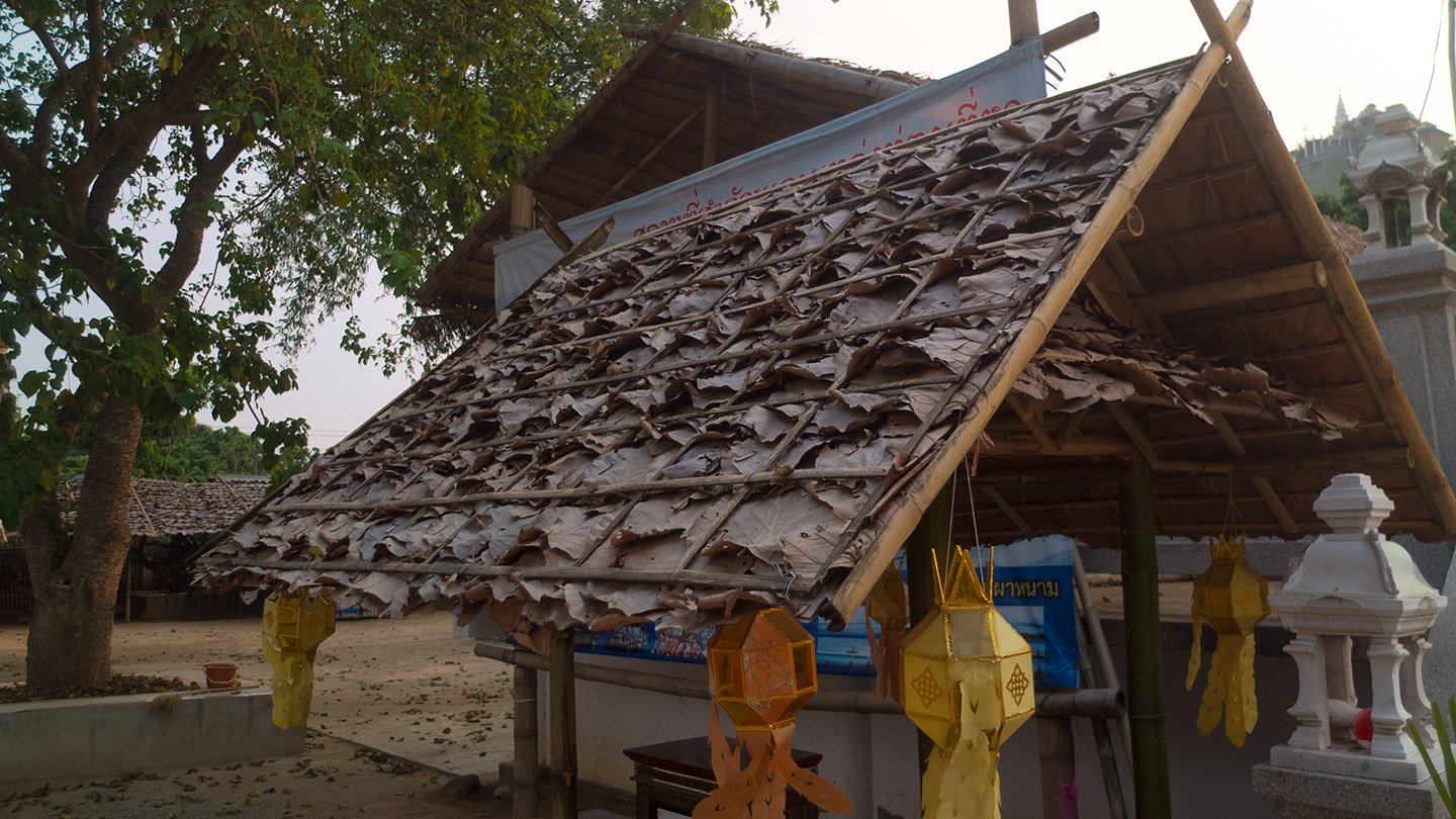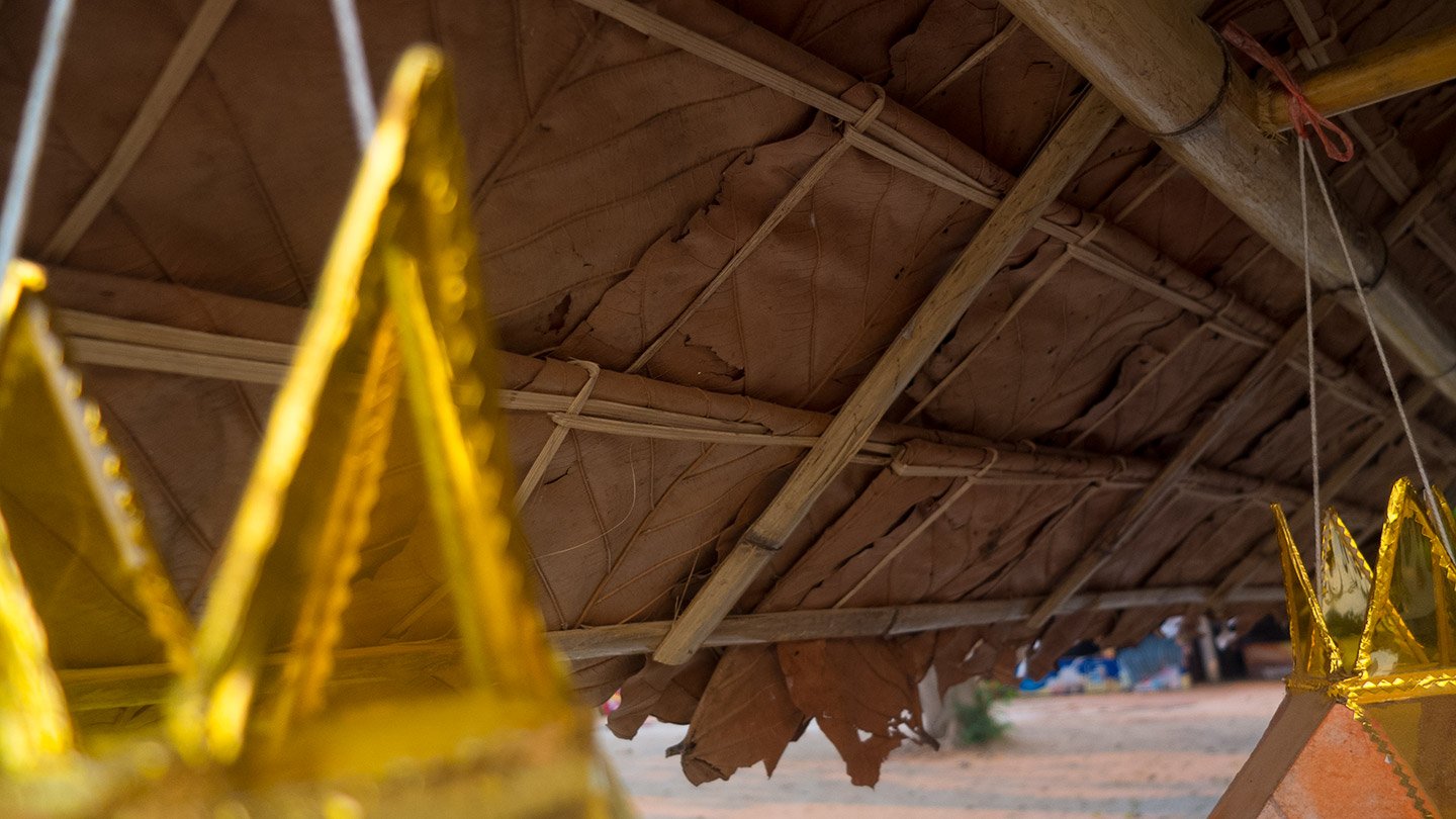 They squeeze leaves between two bamboo frame and let them dry like this. It’s quite clever! Not as aesthetic than straw but the result is the same: that protects from the rain. Maybe not heavy one though.