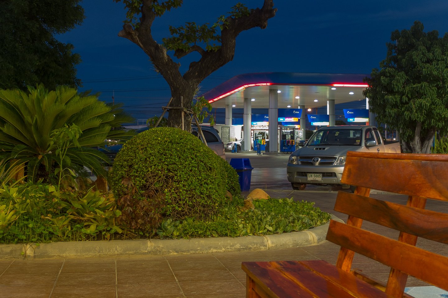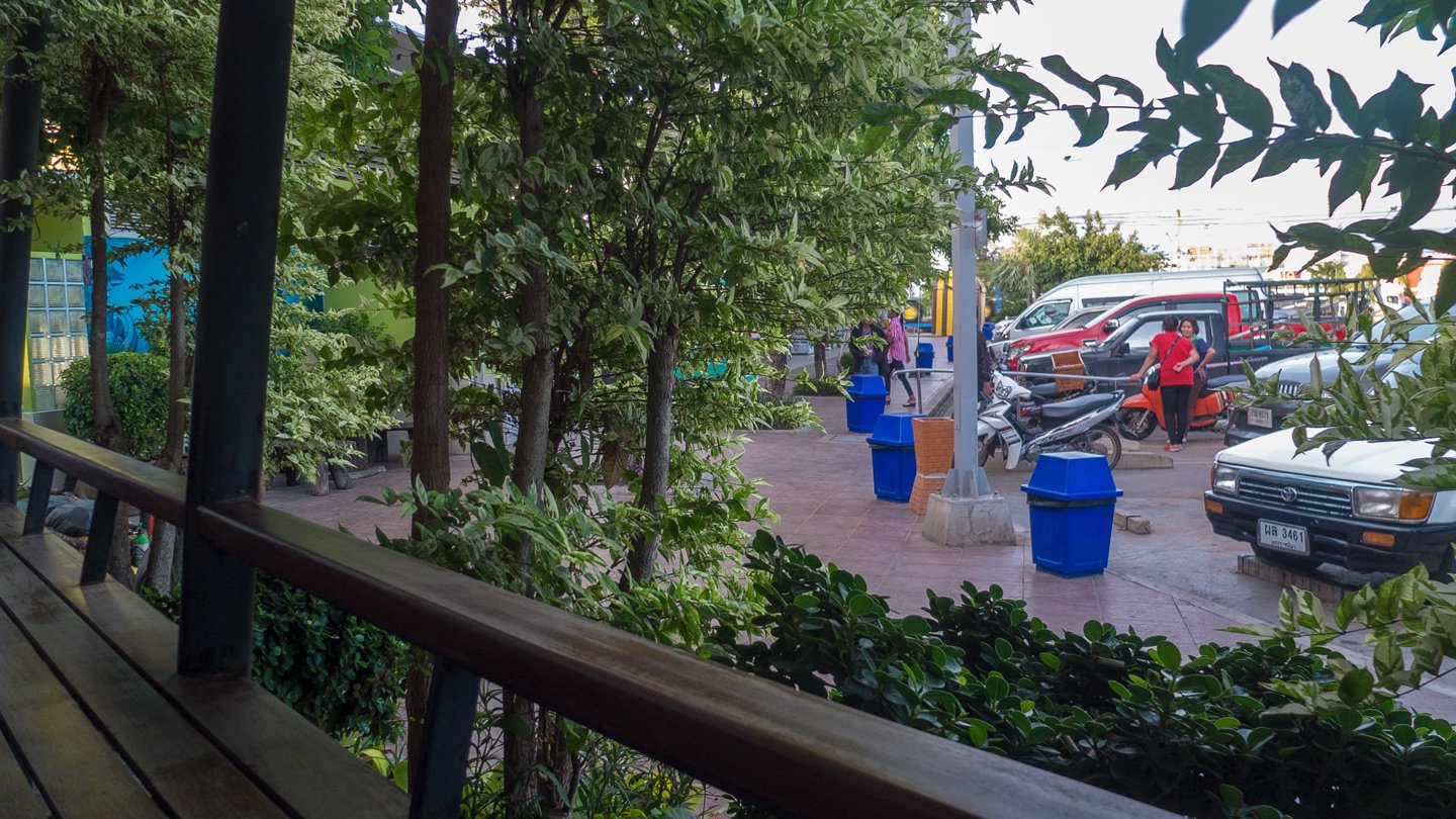 About 3 to 4 hours later, I arrived at the next PTT petrol station where I will even stay tonight I think because this seems to be a very good spot. That’s a nice and solid new shelter behind at the back of the station. I can even stay here to work this morning and will charge my laptop at the café this afternoon.