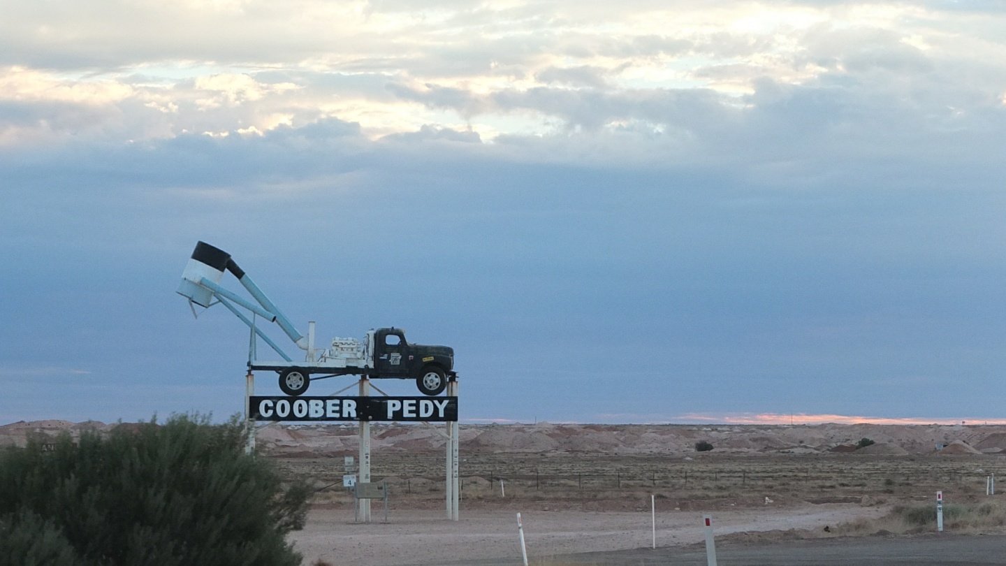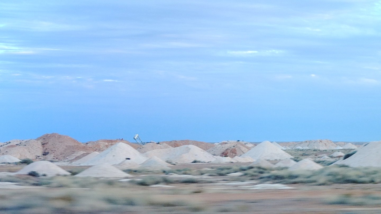 Very quickly, too quickly we are approaching Coober Pedy, a town well known for its Opal mines. Every single cone you see there means there is a hole next to it. A machine digs a hole vertically, then a smaller machine (certainly humans before) digs horizontaly underground until they empty the area and move a bit further repeating the same process. The area is quite dangerous especially at night! I won’t camp their.