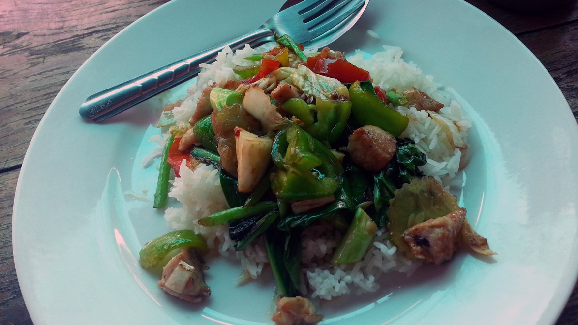 I’ve done about 40km now and I’m starving. Fortunately I’m in a small village and paid 30 baht for this meal. I had to buy some more rice to feel full but that all right. What I like about Thailand (contrary to Indonesia or Malaysia) is there is free unlimited fresh drinkable water. That’s good to eat and drink :-)