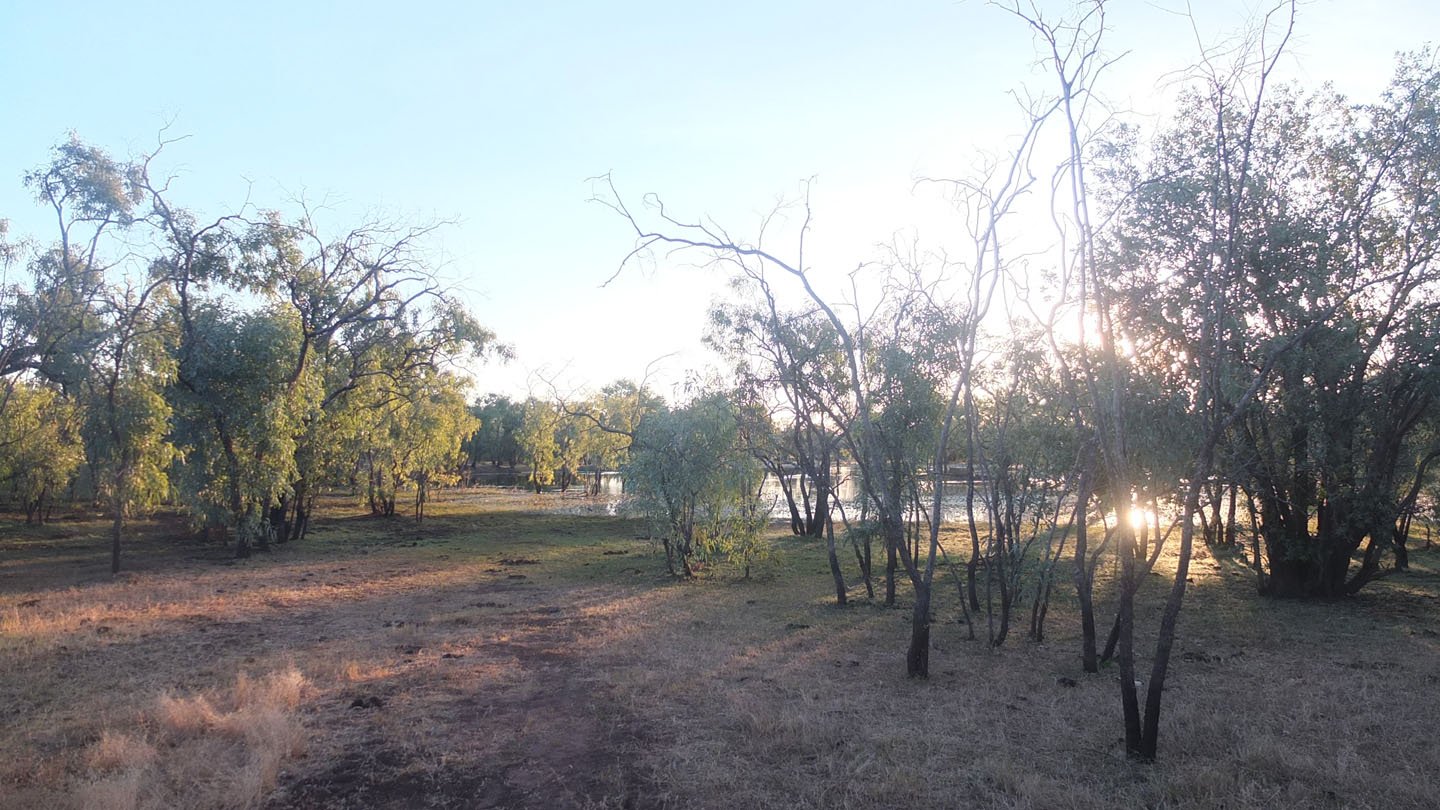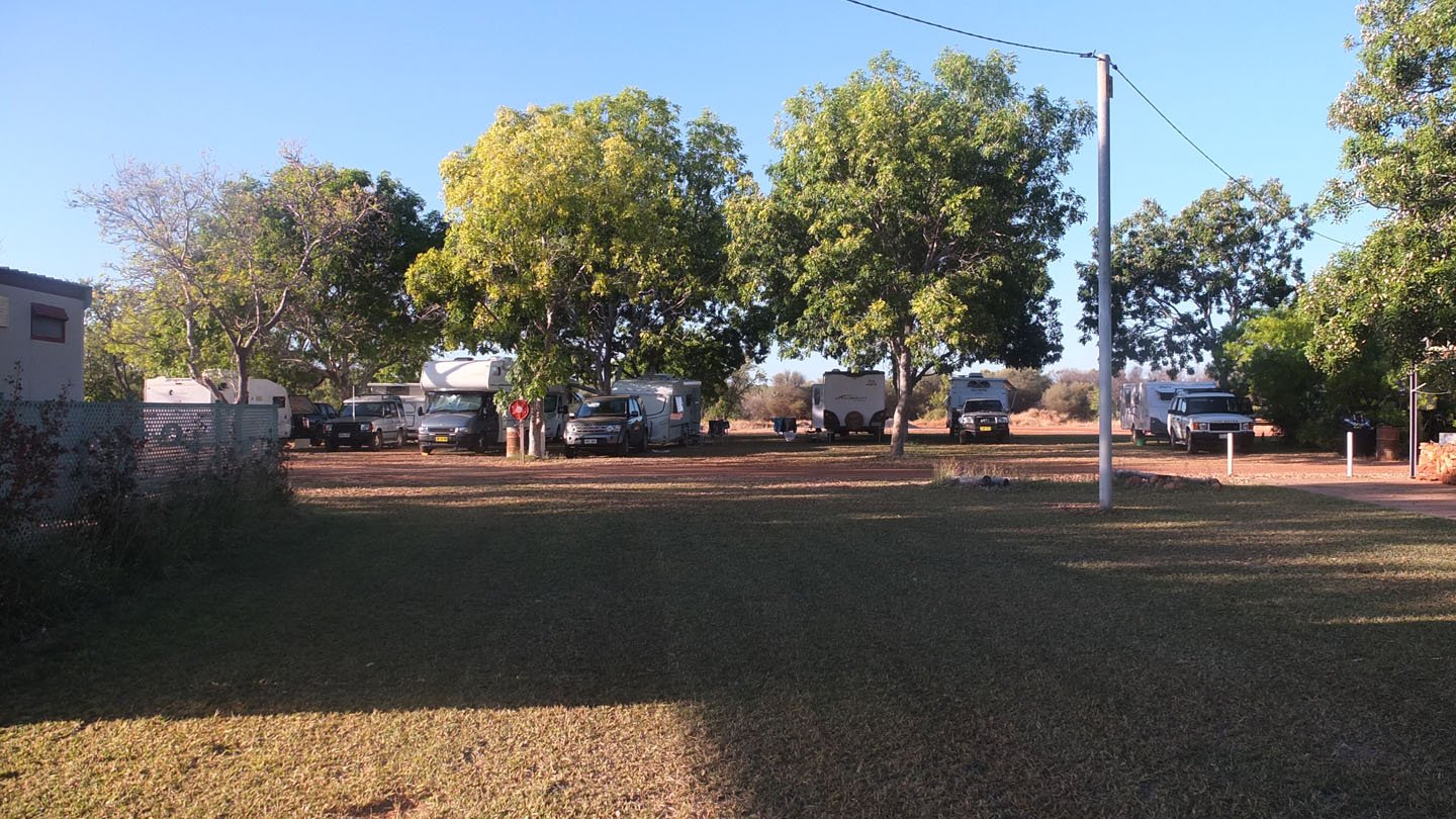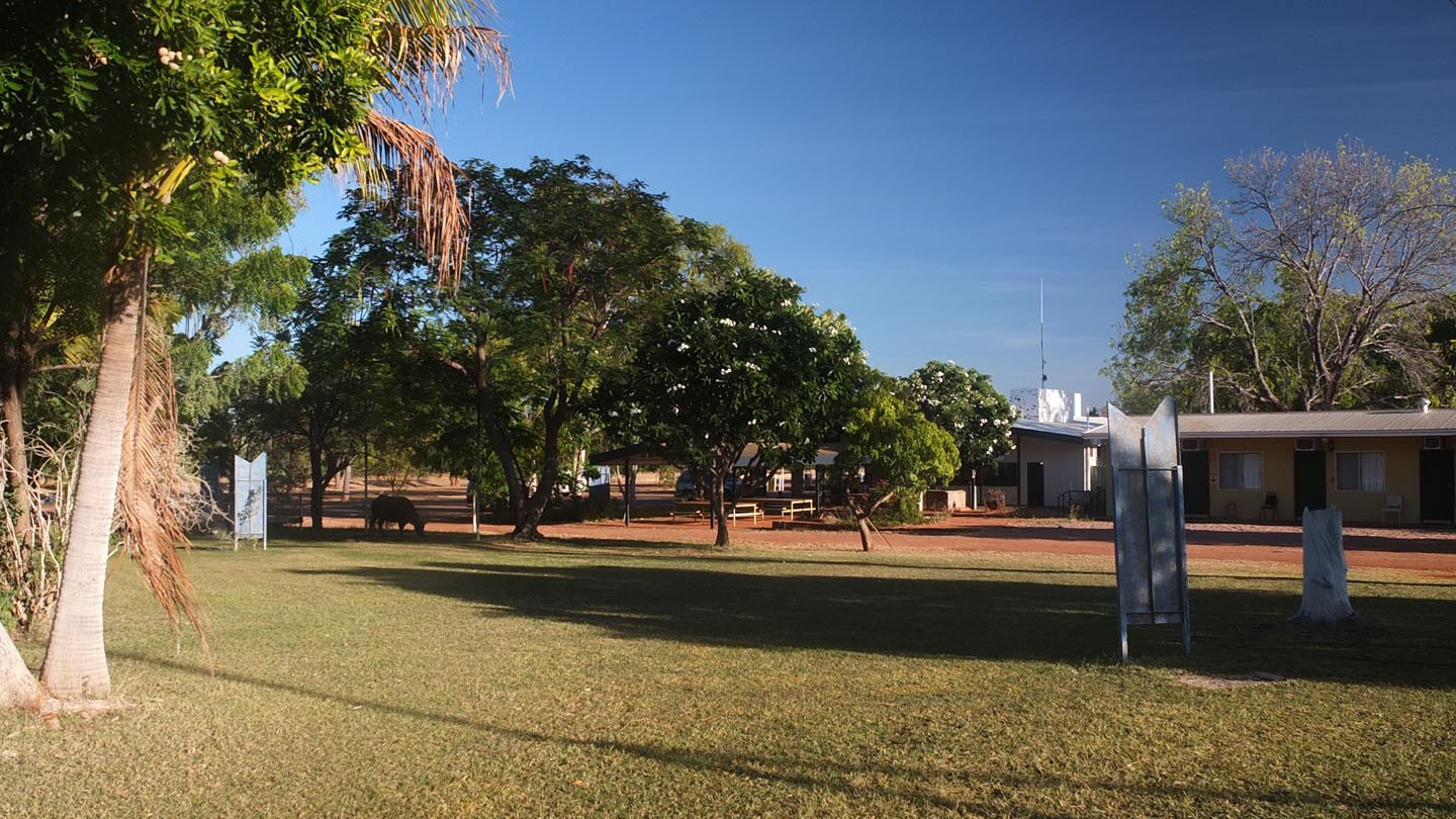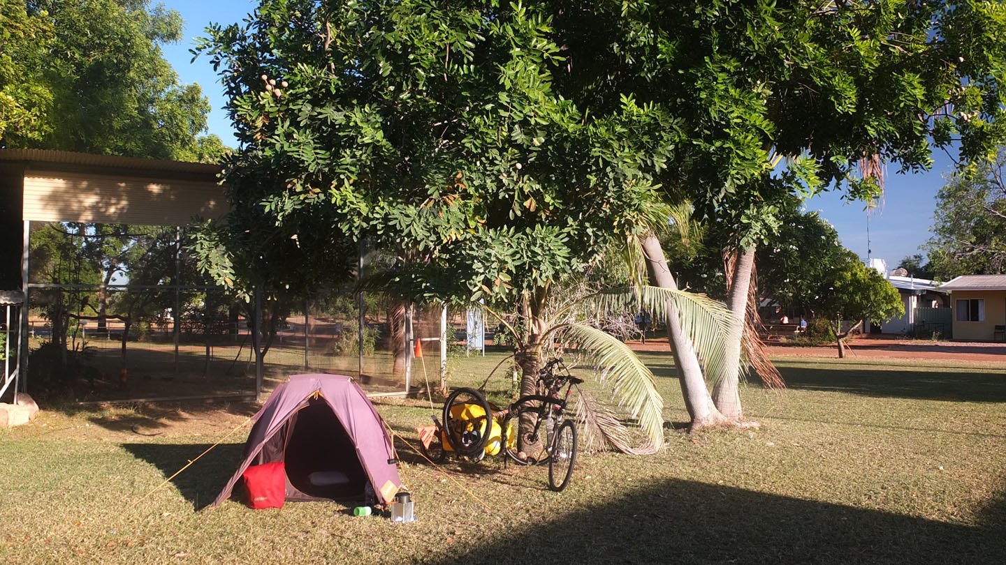 It’s about nine o’clock now and my tent is under the sun but that’s fine because it’s not that hot yet. See, no one around here. This is a pretty nice day as usual up here. No clouds in the sky, more than 30 degrees during the day. The stuart highway is just behind these trees and we can hear and distinguish the traffic from here but I don’t really bother. Just behind my tent there is a big cage with five birds in it. They look like parrots. On the left side, outside of the picture (I like saying that as it’s very useful to describe something which is not visible :-) there is a tiny swimming pool. And the shadow coming from the bottom of the picture is the toilets and showers.