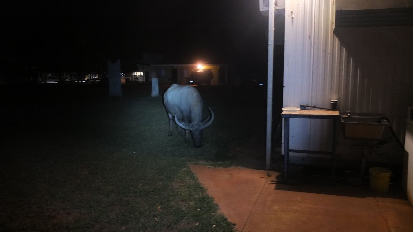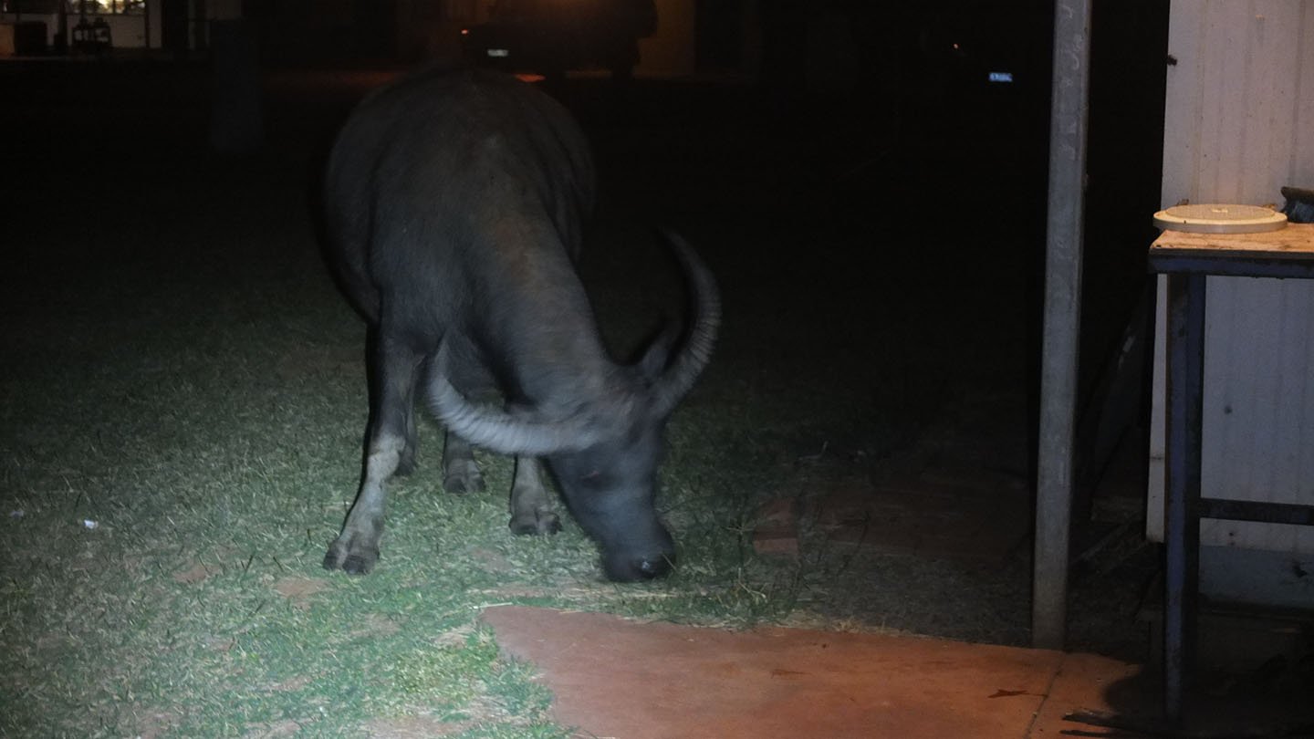 This place is full of animals. After the birds, the frogs, now the buffalo! It’s a pregnant female which lives around. I’ve seen it yesterday afternoon, heard it yesterday night and it’s now front of me :-)