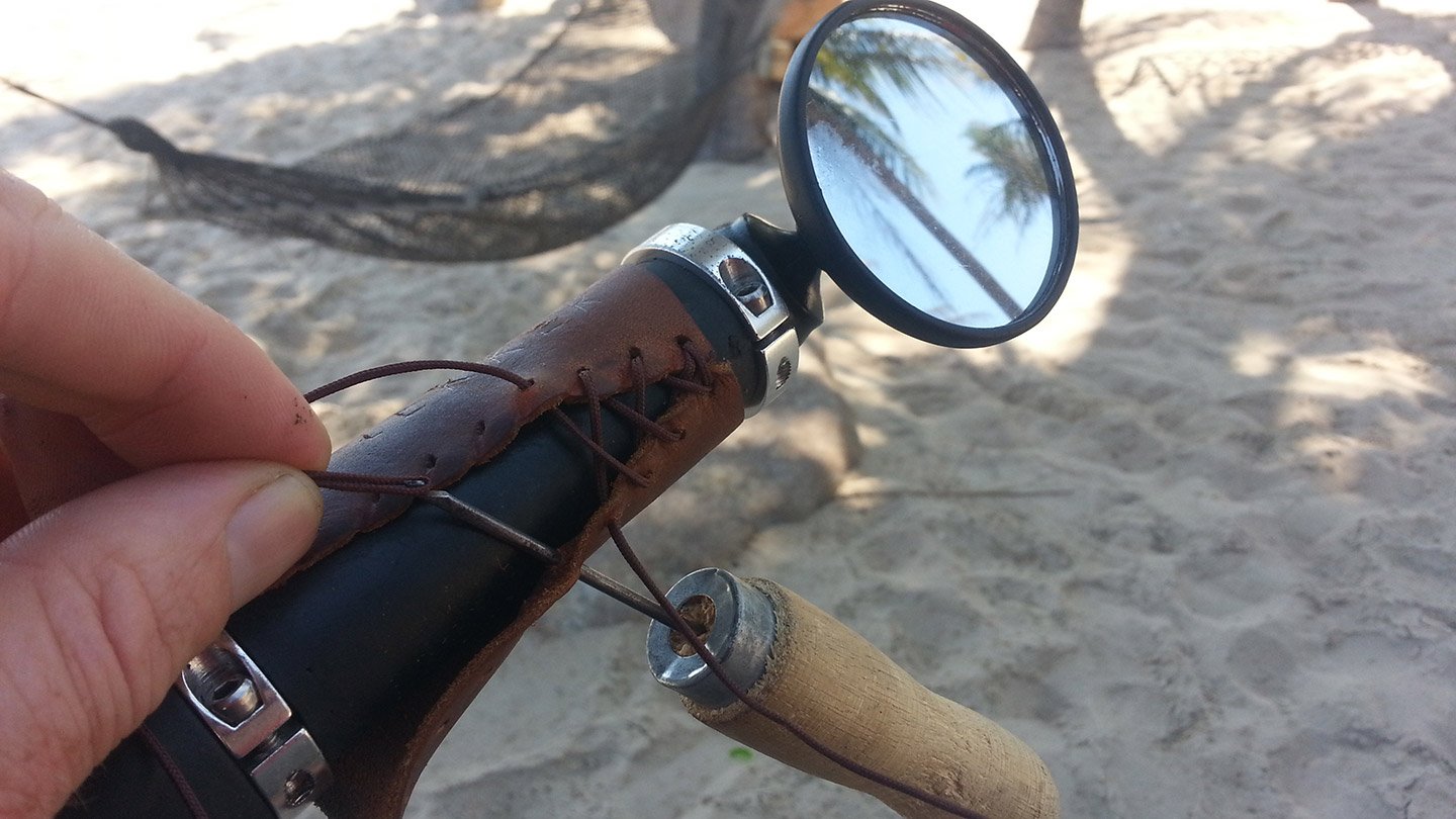 First, I took of the piece of leather, get rid of the old thread and cut about one centimetre of the material to be able to tense it again. Without this tool, it would be nearly impossible. A Monk from Thailand I met in Singapore gave me this one when he saw me fixing my clothes and tyre by myself.