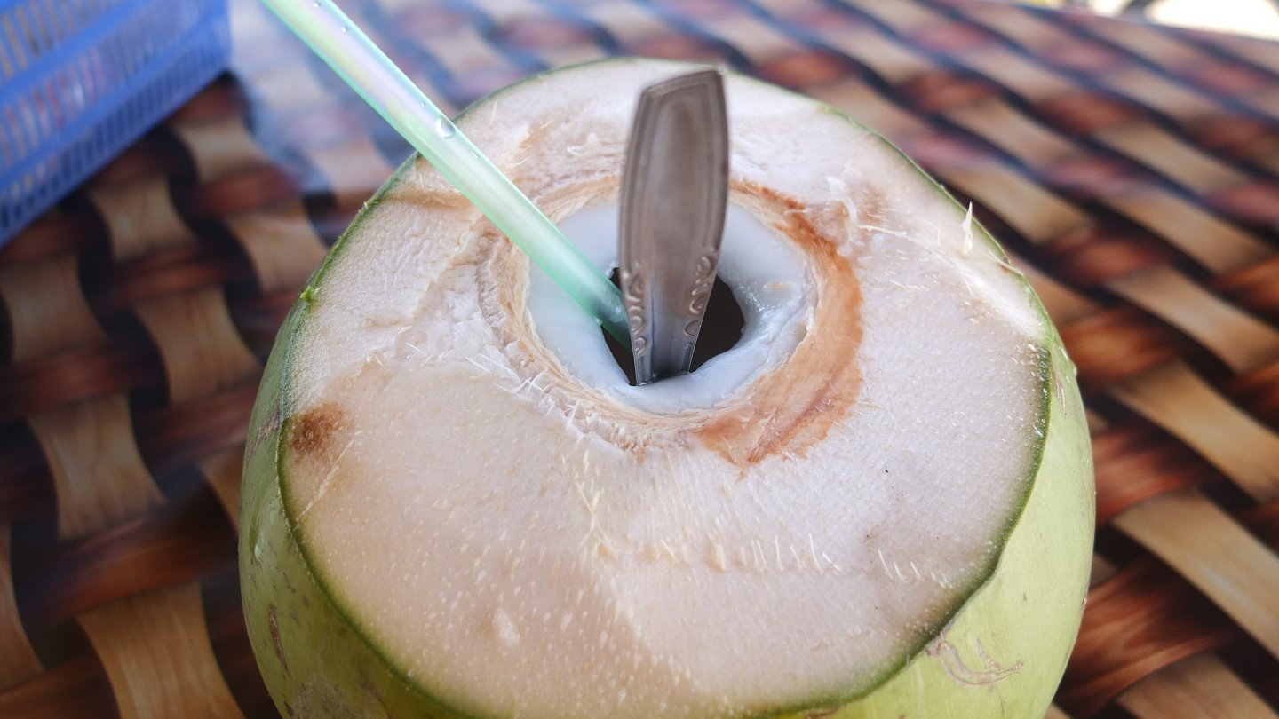 We have done enough cycling this morning (already 40km). It’s time for lunch. Before that, a coconut drink :-) nicely cut by the way.