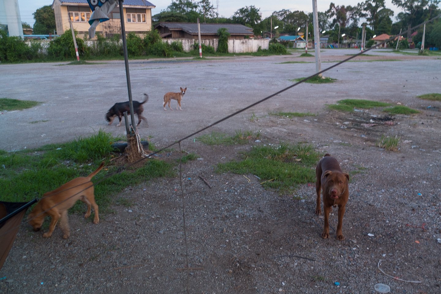 Finally I didn’t cycle a lot today. I should have left earlier or keep on going this morning. Anyway, I want to be in Bangkok on June 16th so that pace is okay :-) I’ve turned around Saraburi and kept on going onto a nice little road. Then I came across this area. Yeh! Looks very nice! At least I can take a picture :-). I had more than enough metres square of roof under which fit my hammock. I tried to see if the roofs behind the bigger building would be quieter but I didn’t even have the time to reach it that dogs from somewhere there started barking. Ok, ok, I must avoid this area and stay as quiet as possible.