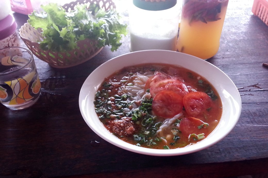 This morning, the first road I chose was a dead end. Maps showed a road crossing the river but when I got there, there was no bridge! The river was too wide and certainly too deep to try anything so I came back from where I was coming from. That was only 3 or 4km lost. Once I finally crossed the river and started my journey I was already hungry. At the next intersection, there was a tiny village where I could get a noodle soup for 12.000 Kip.