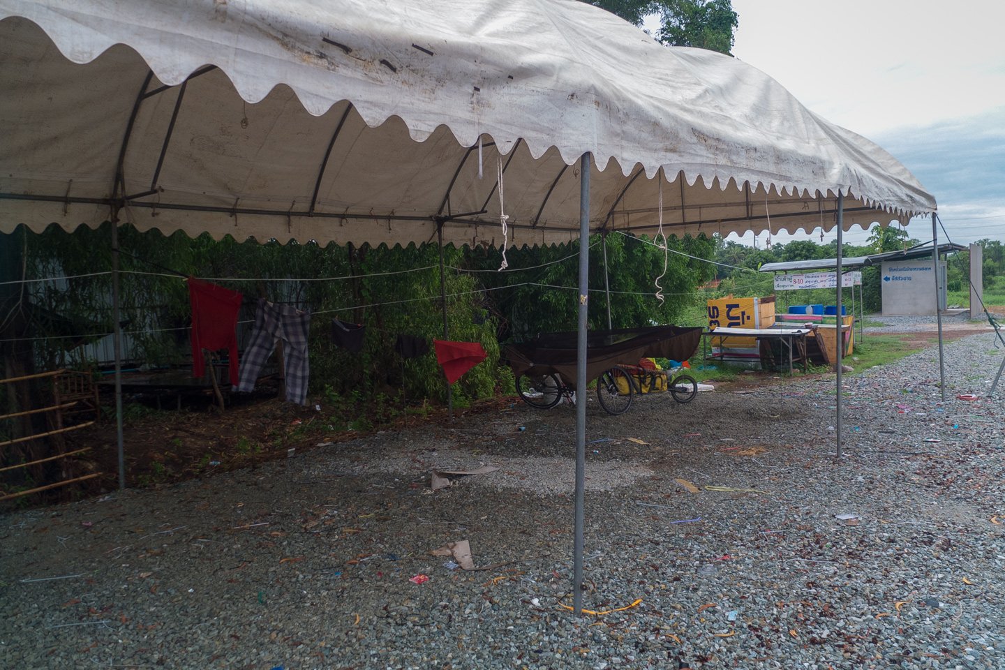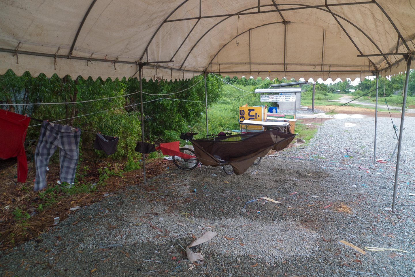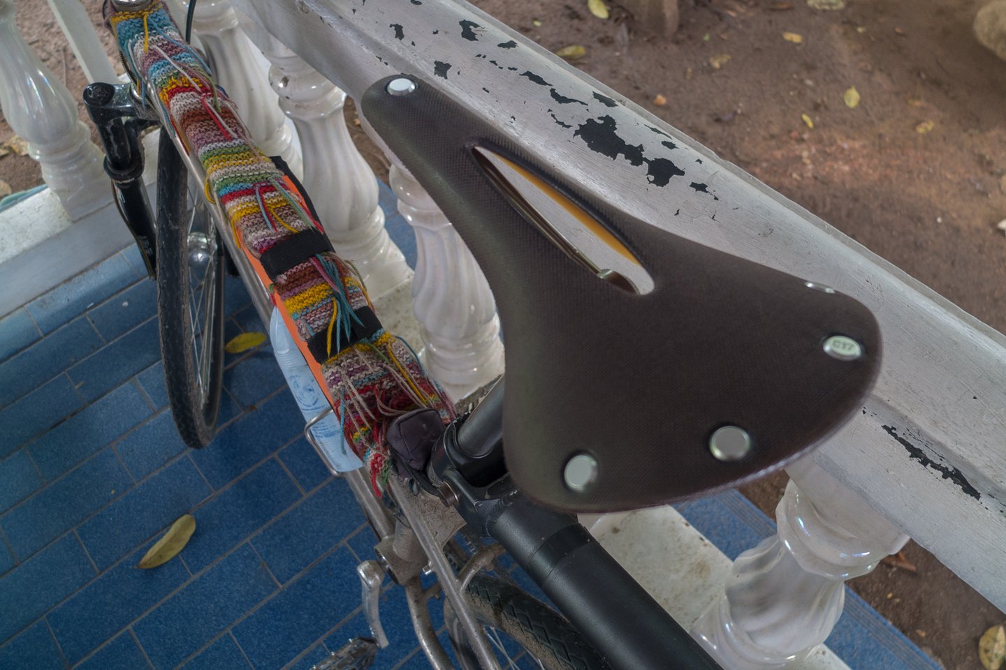 I just arrived to my daily destination. At the back of the petrol station’s car park there is large roof and tables. I will stay here this morning and do some small work on my bike like fitting the new saddle I bought earlier in Bangkok. I will test it later this evening. First impression, it’s more firm than the leather model. The rubber is pretty soft in the center, but the back is obviously harder because of the bold and the saddle’s frame. At least, it looks great :-)