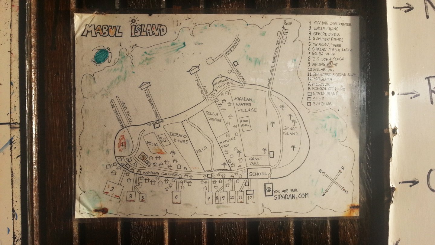 The map of mabul island. Everything that is on the north-east side is made for tourism. The bottom part is occupied by the two villages.