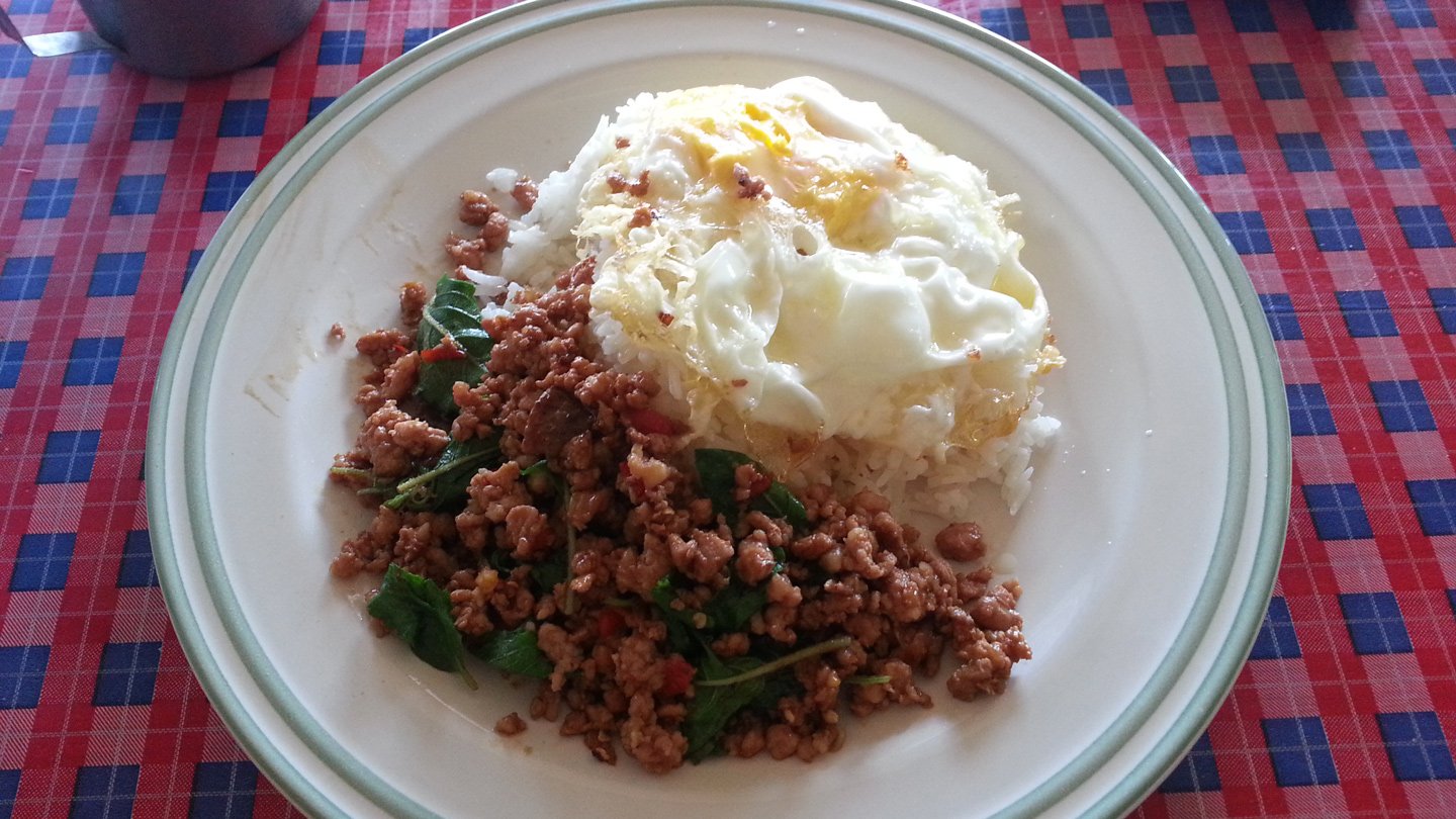 That’s breakfast time :-) Chicken with basil plus rice and fried egg.