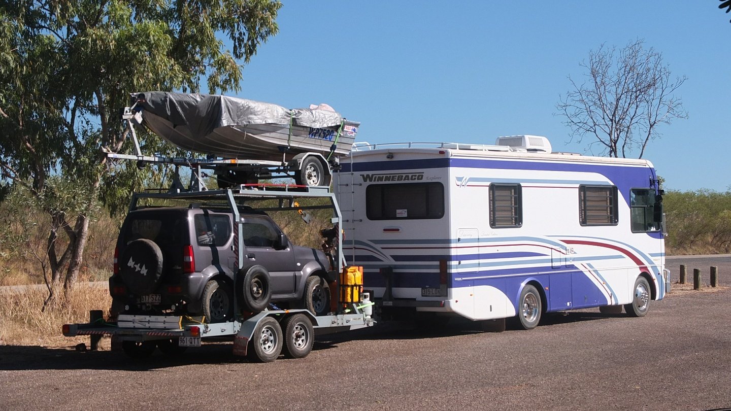 Look at that set up. A bus towing a car plus a boat sitting on it’s own trailer. Wow!