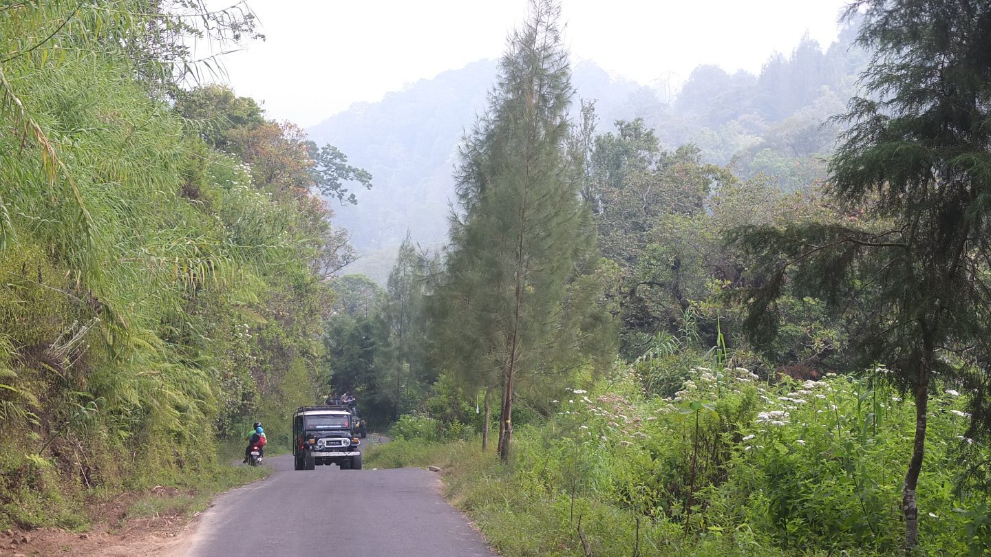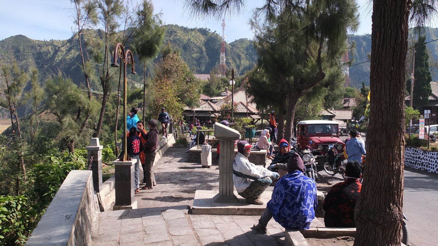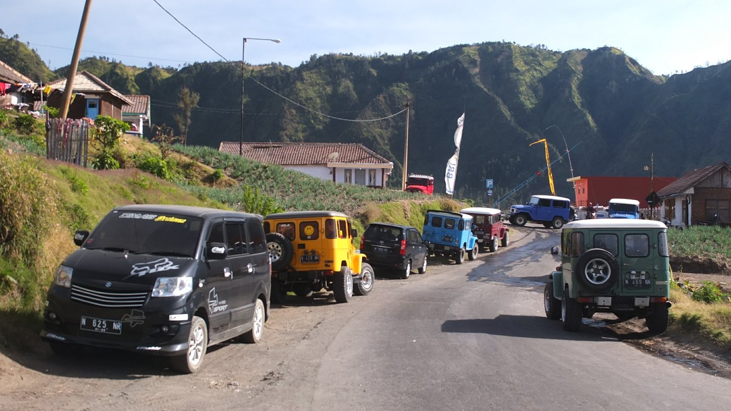 When I arrived to the beginning of the village, a bunch of guys was waiting in the middle of the road. There was also a fence and a counter. What do I have to pay again. I stopped there and try to understood why, and how much I had to pay. The said “Bromo, blablabla”. There was a map of the National park and I explained to one of them that I did not want to visit Bromo but only cycle though the National Park. I don’t know if it’s because I was good enough that time but then the guy inside the counter said: “That’s ok, you can go, special for you”. Don’t tell me that twice! I came back to my bike and continued my way to the top. I know I’m not too far now when I see all those Jeep in the area :-)