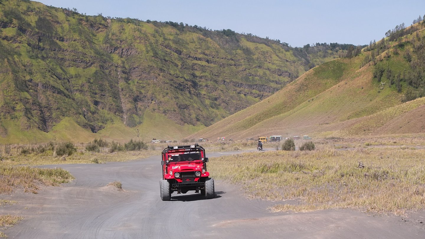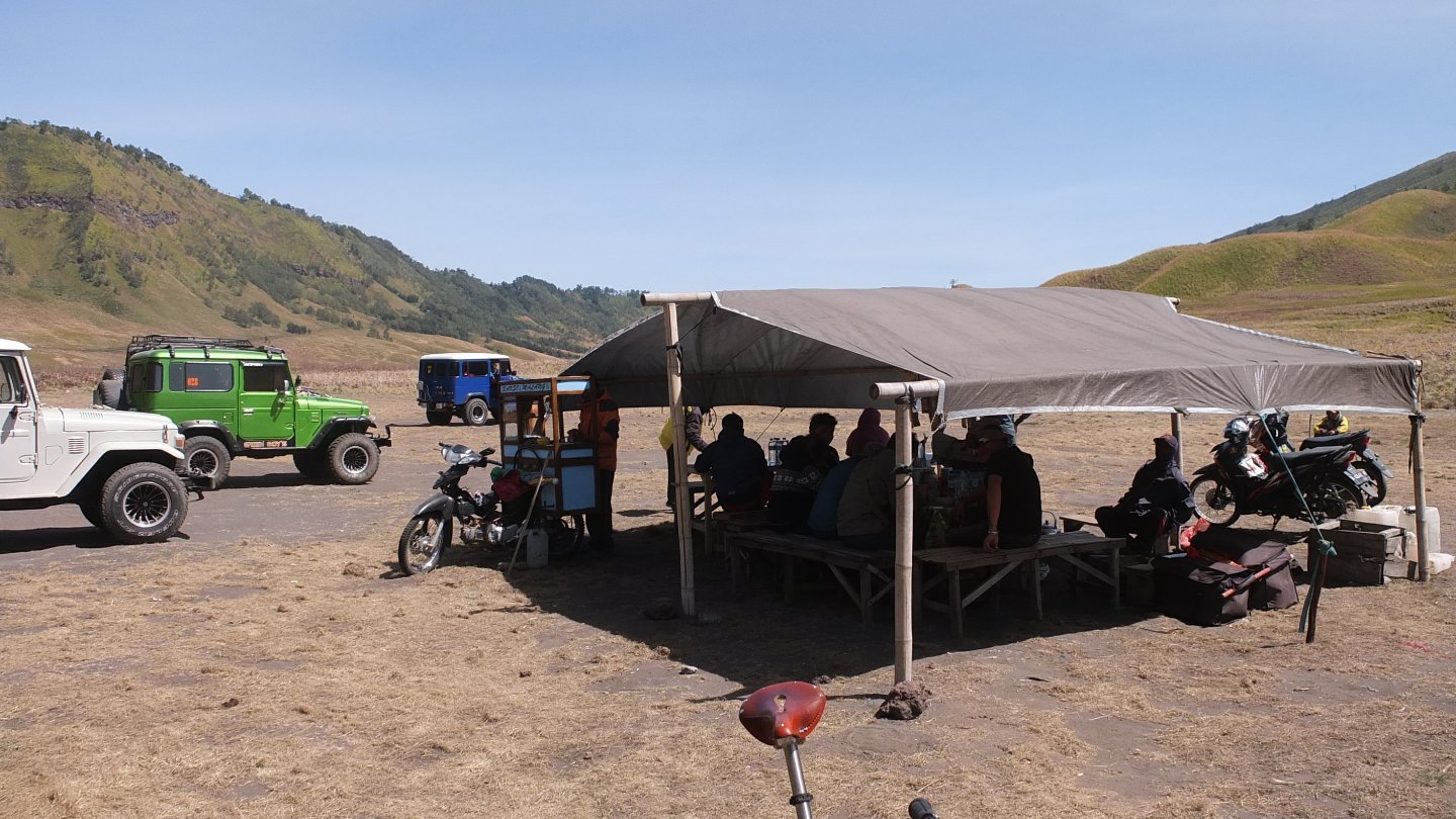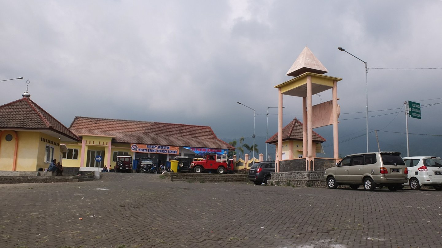 When I arrived to the beginning of the village, a bunch of guys was waiting in the middle of the road. There was also a fence and a counter. What do I have to pay again. I stopped there and try to understood why, and how much I had to pay. The said “Bromo, blablabla”. There was a map of the National park and I explained to one of them that I did not want to visit Bromo but only cycle though the National Park. I don’t know if it’s because I was good enough that time but then the guy inside the counter said: “That’s ok, you can go, special for you”. Don’t tell me that twice! I came back to my bike and continued my way to the top. I know I’m not too far now when I see all those Jeep in the area :-)