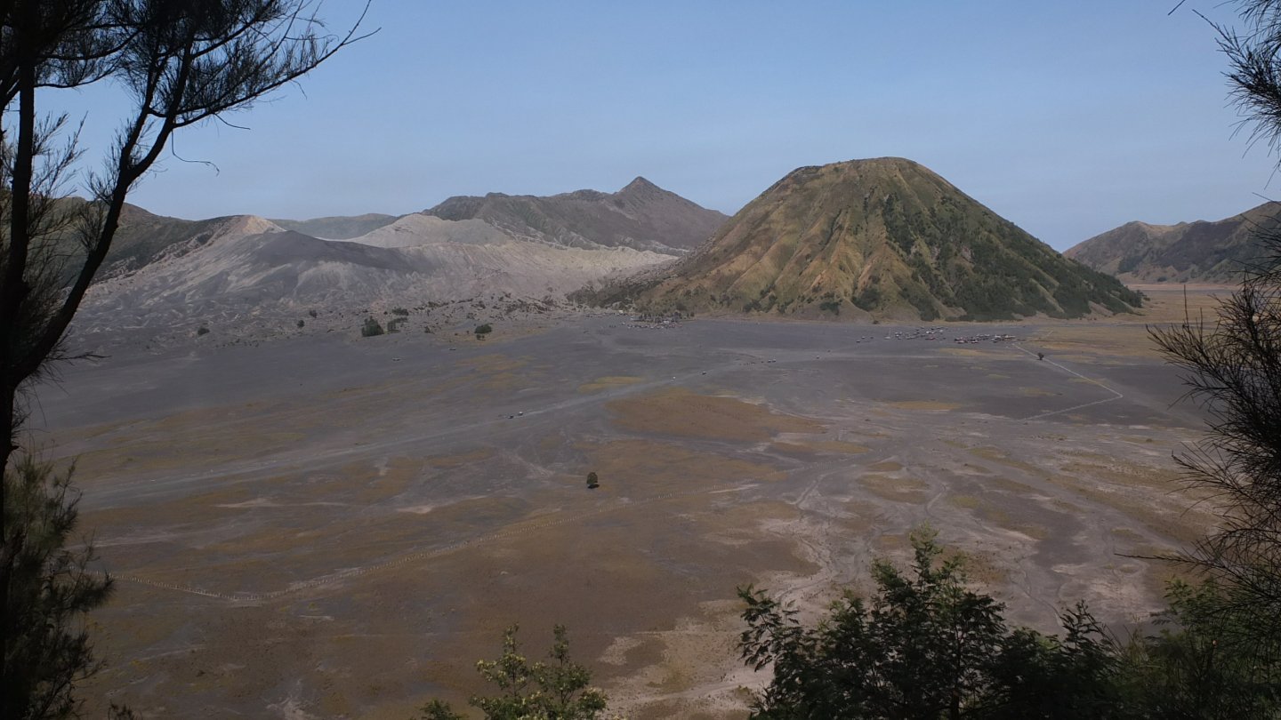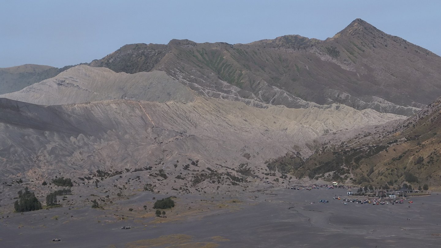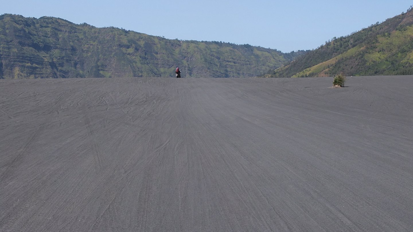 I was down there yesterday and then walking up that thin white line, the stairs, up to mount Bromo, the huge light grey crater on the left side. Now, I’m not going to come back but will turn around (see the map up that page).
