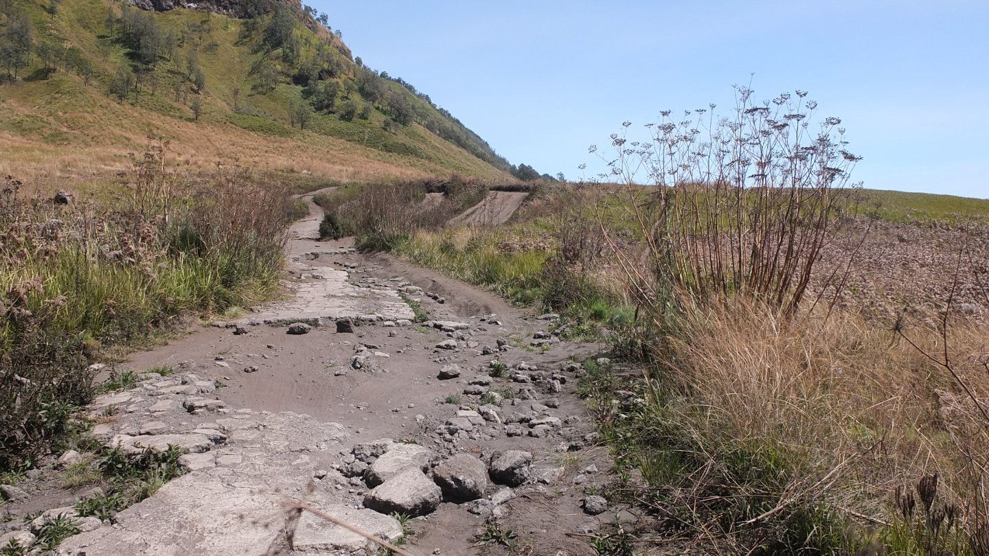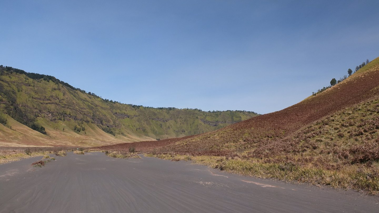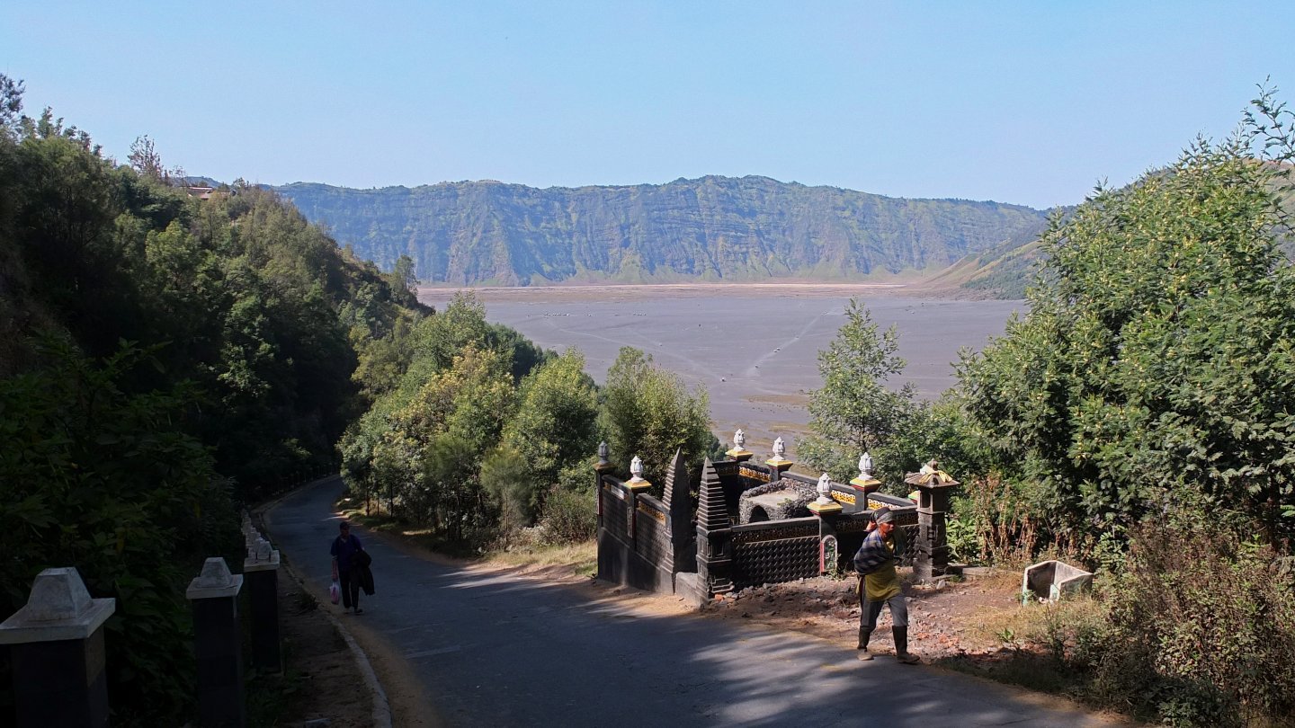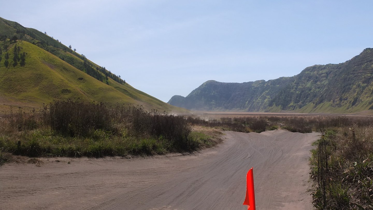 I was down there yesterday and then walking up that thin white line, the stairs, up to mount Bromo, the huge light grey crater on the left side. Now, I’m not going to come back but will turn around (see the map up that page).