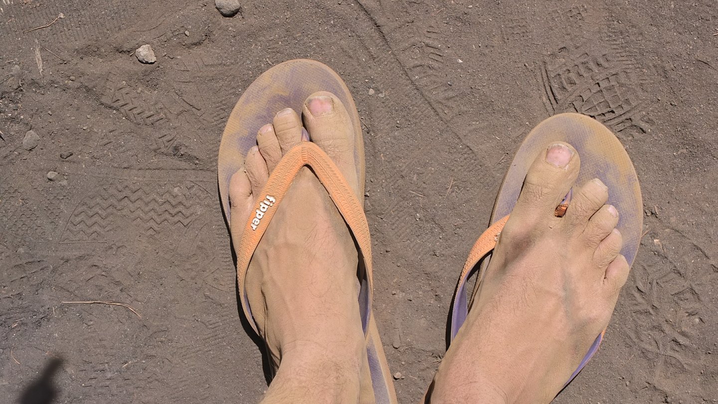 Like this last part. The top of the hill is just there! It’s steep, too steep. I’m walking, pushing, swearing in english and French (I should learn some Indonesian as well). The dust is so thin that when my feet get covered, I lose my thongs… Rah! come on!