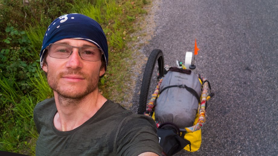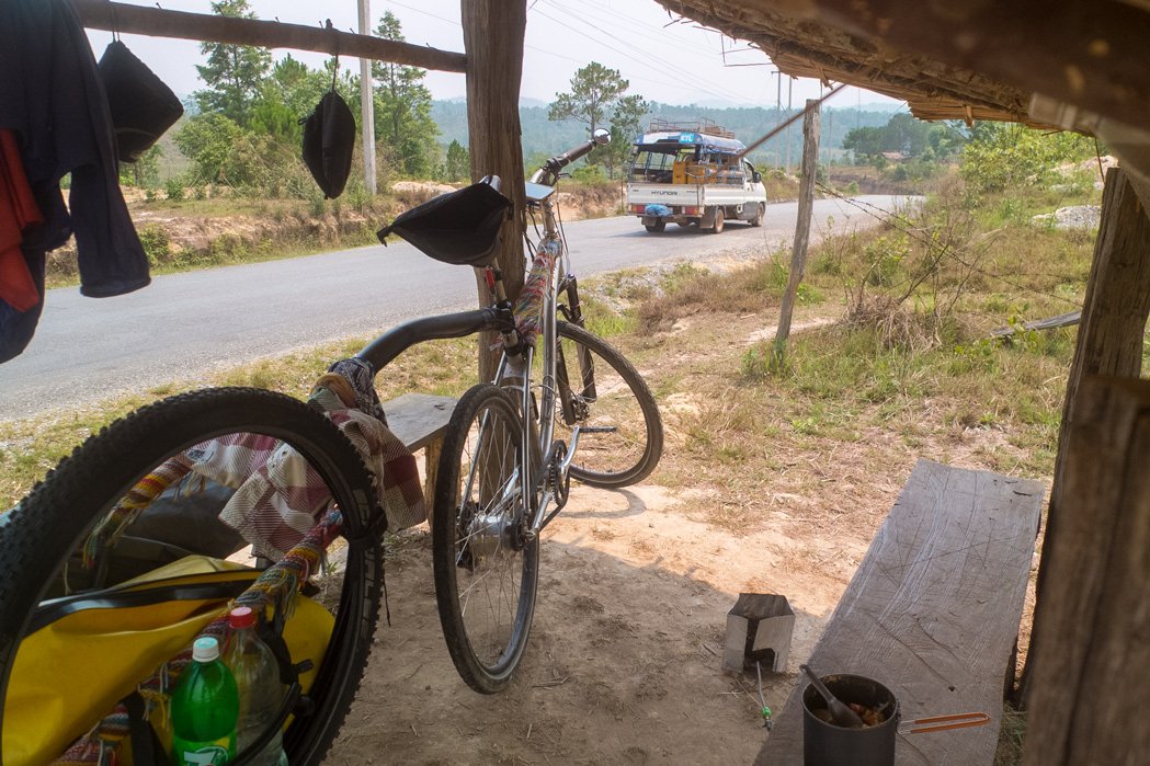 Finally, as I was starting climbing a long hill that reminds me what I’ve done the past 8 days, I’ve found a tiny flat area on the side of the road next to a destroyed tiny shelter. First, I thought I could fix quickly this shelter but I knew the next storm would blow up everything again. For now, I didn’t hear any thunder yet but sometimes I could see some flashes in the sky. As quick as I could, I set up my camp, on the ground again before another “friendly” storm would hit. The steps in order: Roof first, then footprint, hammock, mattress, sleeping bag, shower, dinner, close everything tightly against rain, lock the bike and sleep.