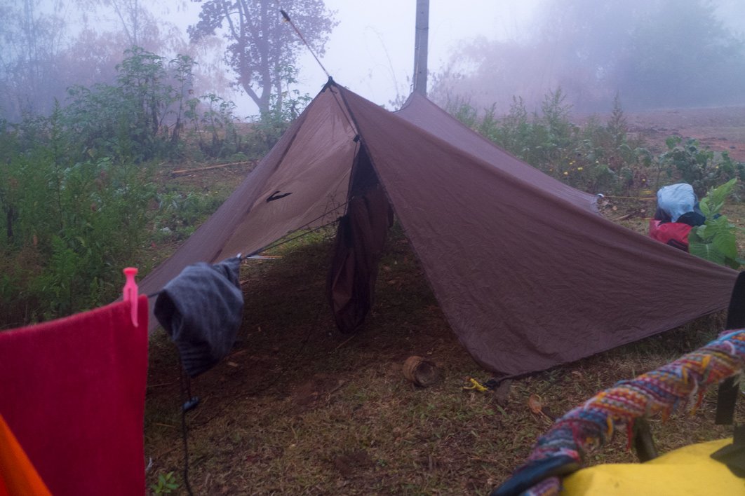 And that’s what I’ve done :-) I had to walk many times as I became quite tired at the end of the day. I reached the top at night time. Then I’ve done 90% of the following downhill and found a spot at the entrance of a village called “Ban Nam Poung” (“Ban” means village). On a side of the road I’ve seen a land situated in the hollow of the mountain. Only the beginning of a construction was sitting there, not even concrete, just wood poles attached together. Well, I thought it was a good spot for the night.