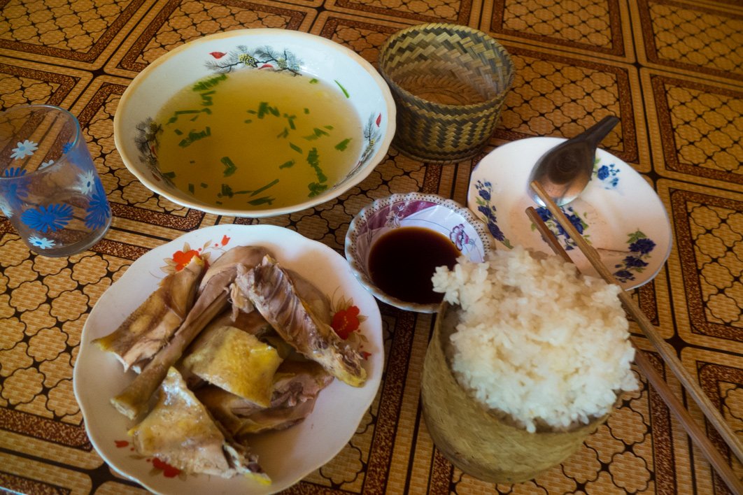 For the first time I’ve got something else than noodle soup. The owner even told me the price BEFORE I decided anything. It’s a bit more expensive than usual (35.000 kip) but I don’t know if I will find something else anytime soon. Today’s menu is a soup with sticky rice and “al dente” chicken. In fact in Laos (like Thailand) people don’t bother cutting the chicken regard its shape. They just chop it through the bones. Some parts do not have even meat, just bones.