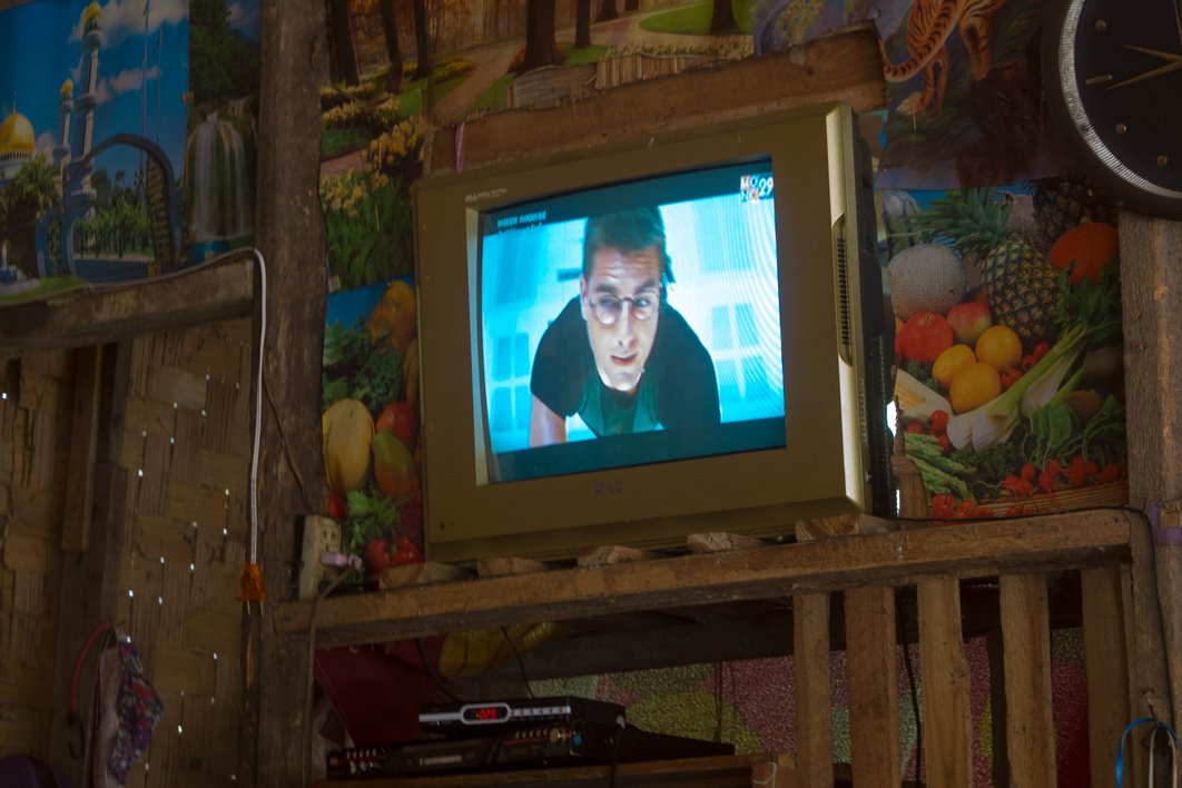 The owner and her son are watching an old american movie (Mission Impossible 1). The voices are in Thai and subtitles in Laos. Fortunately, I know the story already :-)