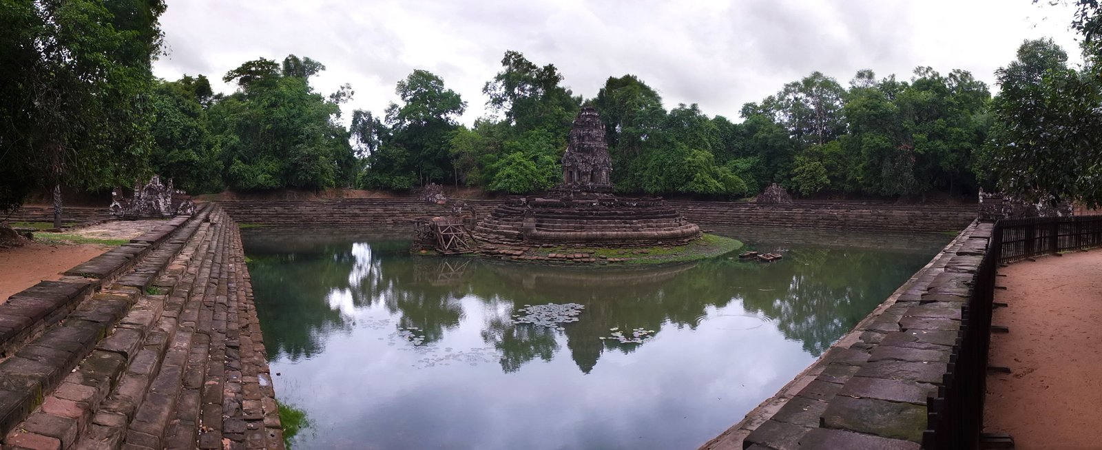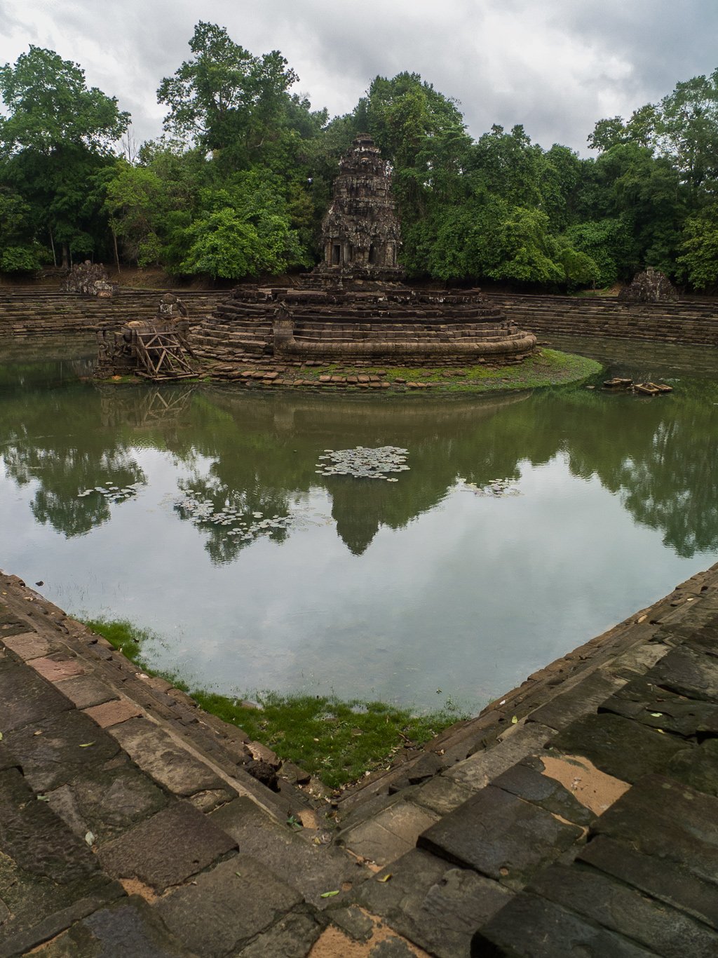 Neak Pean (or Neak Poan) (Khmer: ប្រាសាទនាគព័ន្ធ) (“The entwined serpents”) at Angkor, Cambodia is an artificial island with a Buddhist temple on a circular island in Preah Khan Baray built during the reign of King Jayavarman VII. It is the “Mebon” of the Preah Khan baray (the “Jayatataka” of the inscription).