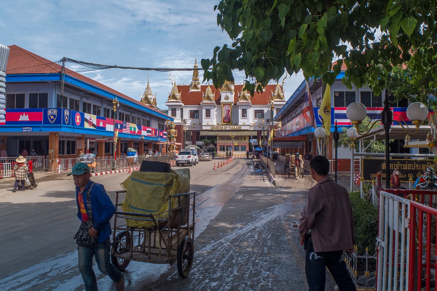 That should be this way somewhere. That border is a bit messy. There is so many people pushing and pulling trailers full of goods all around the place. I’m not sure where I should ride yet, left or right? At least, I’ve got a trailer too, I’m not that different then :-)