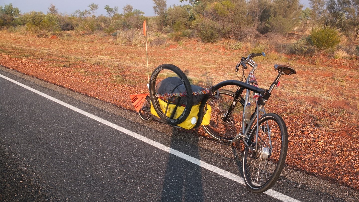 This is quite hot now. I’ve stopped cycling at 11:45am when the temperature was 34 degrees and it must be hotter now. I met another Italian couple driving down to Uluru. We’ve spent lunch together. Later on, an aboriginal woman called Wow-Wow (not sure about the spelling) came to us for a chat. But as usual, and unfortunately, 5 minutes later she asked for money to buy beer and cigarette paper. After 30 minutes, the Italian couple came back from the roadhouse and offer me an ice cream! So many people offer me food these last days. I must look very skinny!