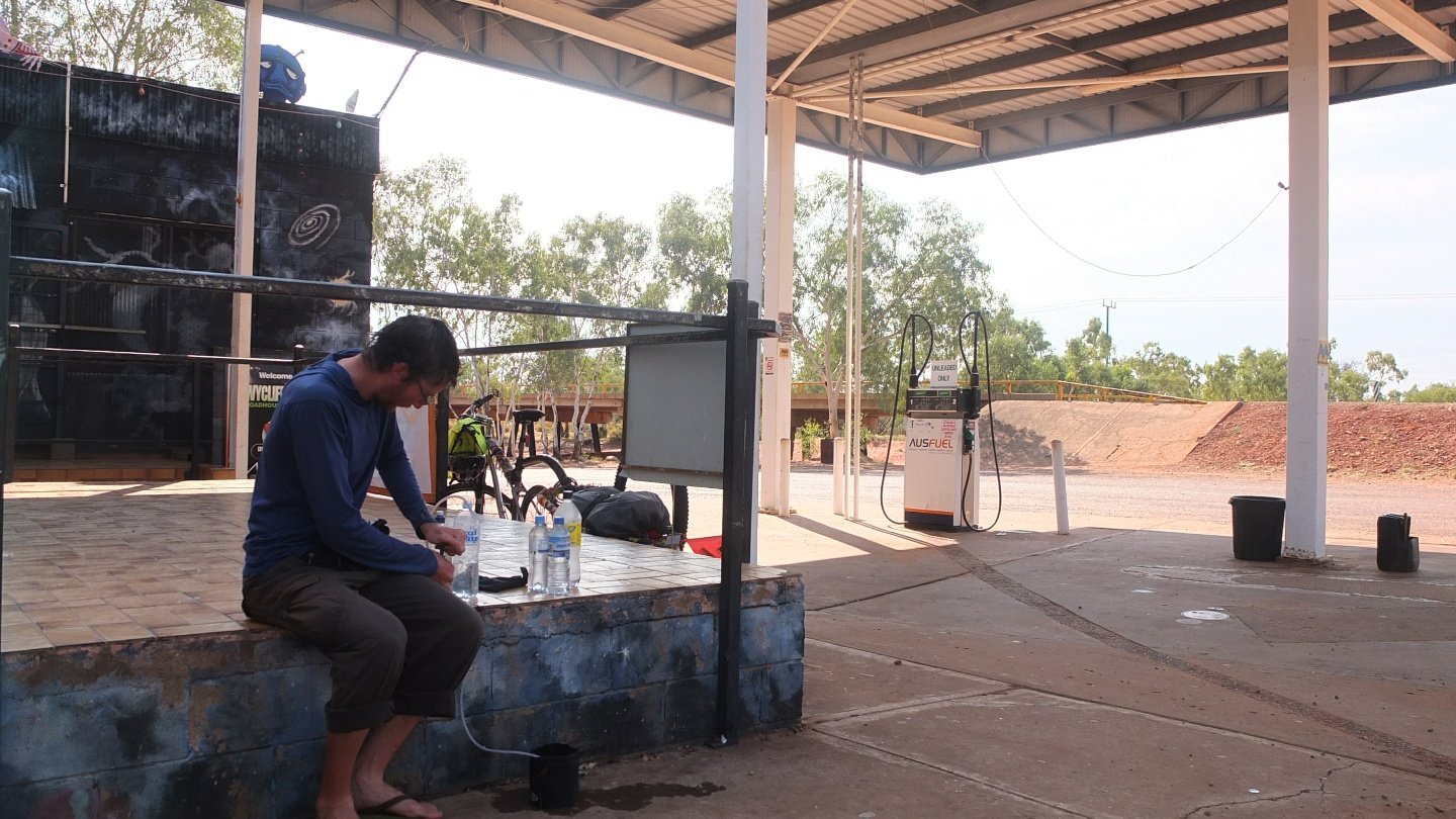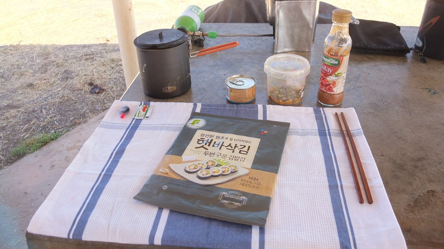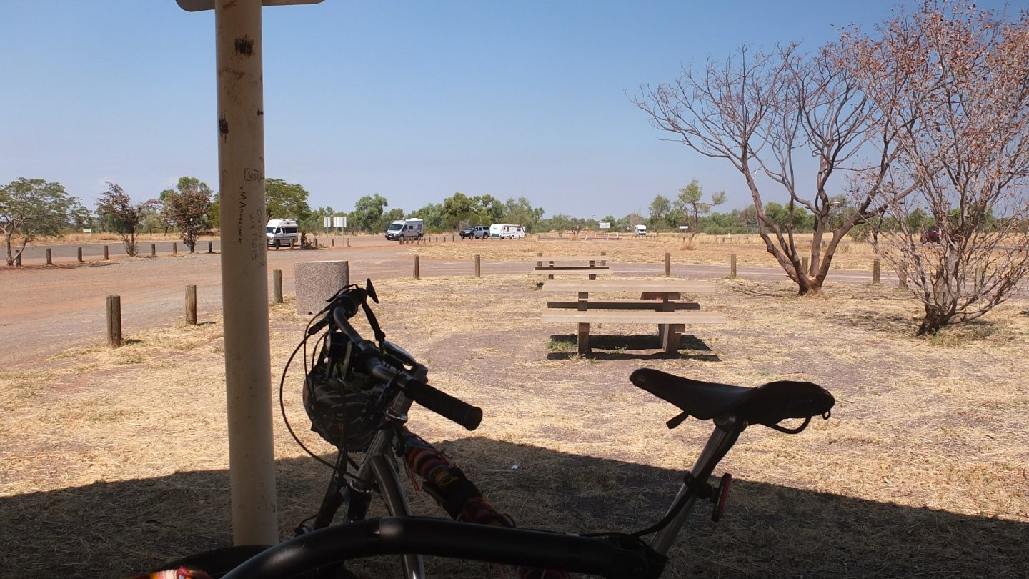 Again, finding a place where to pitch my tent was tricky but I could managed that :-) I’ve met Amy and Jude who are travelling towards Darwin as well. Not like the majority of the travellers here, they have a tent like me. They offer me a tea and I brung the biscuits then did our own stuff for one hour or two. I’ve fixed my front tyre again as the stitches became weak. Later on, we had dinner together, this time I brung the rest of the sushi I made during lunch time and they cooked some beans, mash potatoes and tuna, green beans. All together was lovely :-) Finally, we went to bed early. Tomorrow I will wake up before six, expecting to be on the road before sunrise! See ya :-)