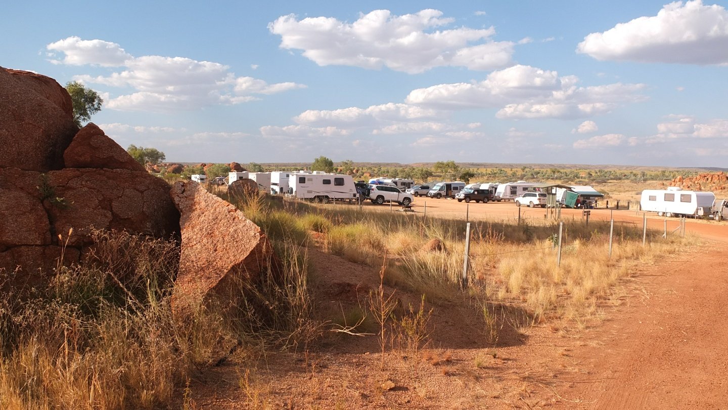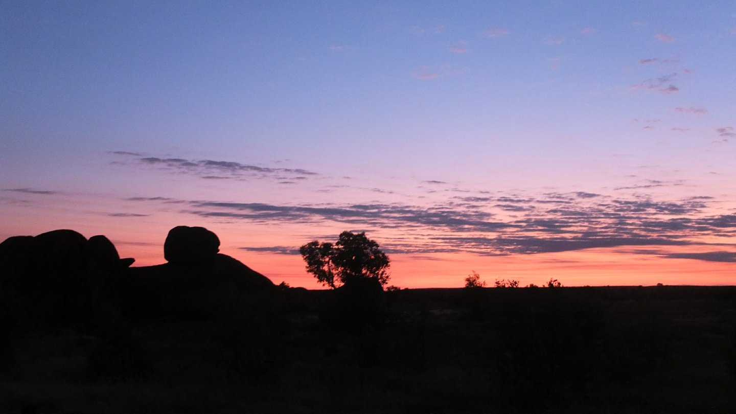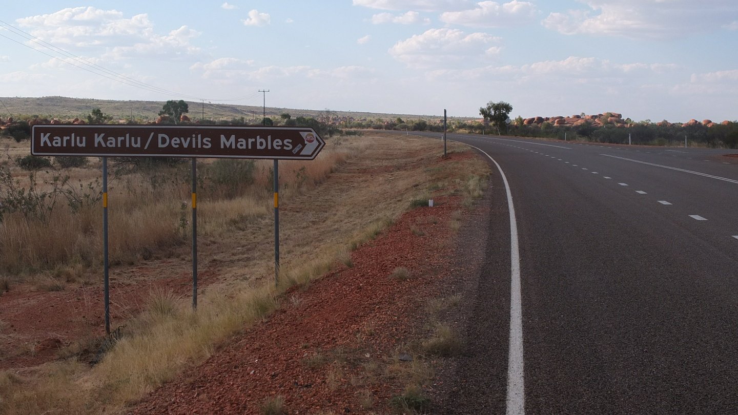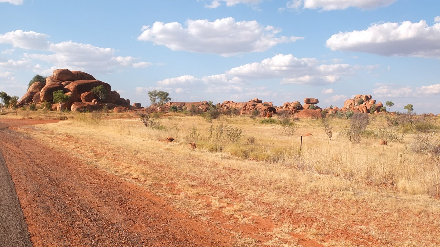 Pretty quick cycling today as I’ve got no wind to bother me and I’ve started early this morning to avoid the heat. During a long lunch time I got involved with an Aboriginal woman who wanted me to buy alcohol for her (with her money). Another guy came for the same purpose until I found the solution to eclipse myself and hit the road again. I arrived early in Karlu Karlu camping area which is a nice one from what I’ve read online.