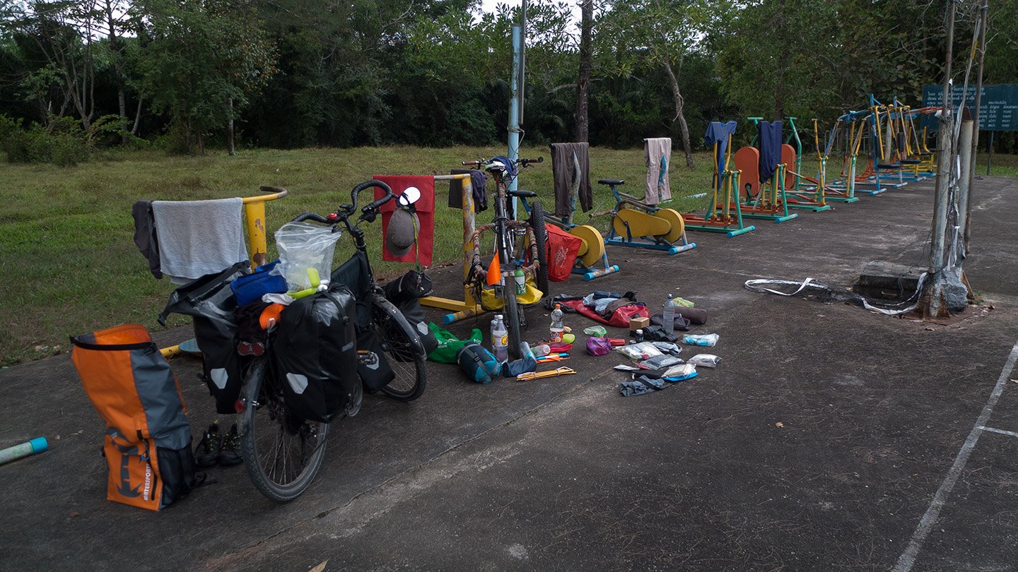 Finally, we stopped at a sport field. Villagers haven’t use this place for ages I guess. Every equipment is rotten. At least they are useful to dry clothes :-). I’ve completely emptied my bag to get rid off the humidity before it smells death inside.