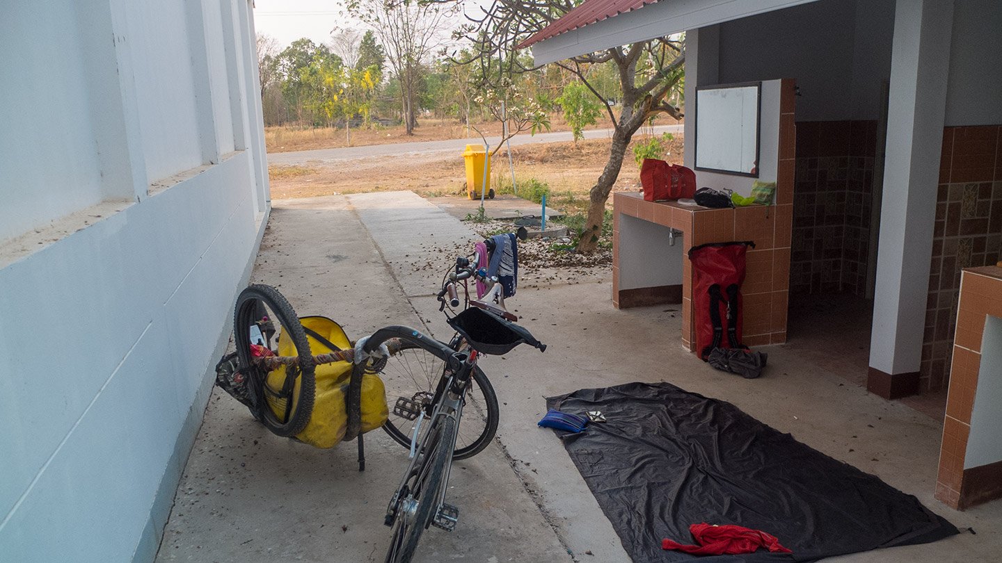 Last night was OK. I did not dare to set up my hammock in that super clean place the monk offered us to sleep in. We could use mat and slept on the tile floor. That was a firm night as you can imagine. Surprisingly, it’s not that uncomfortable. It reminded me Shen (who I met in Malacca) who purposely slept on hard surfaces. He explained that it was part of the “Paleo” lifestyle (like the way of eating non processed food or having cold showers). Apparently, it’s good for the back. The first time I’ve had this kind of experience was in Indonesia when I had been invited by students. They slept every night on a simple carpet. That night I copied them and had a surprisingly good night.