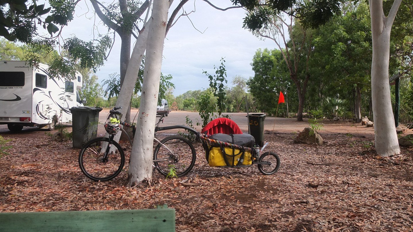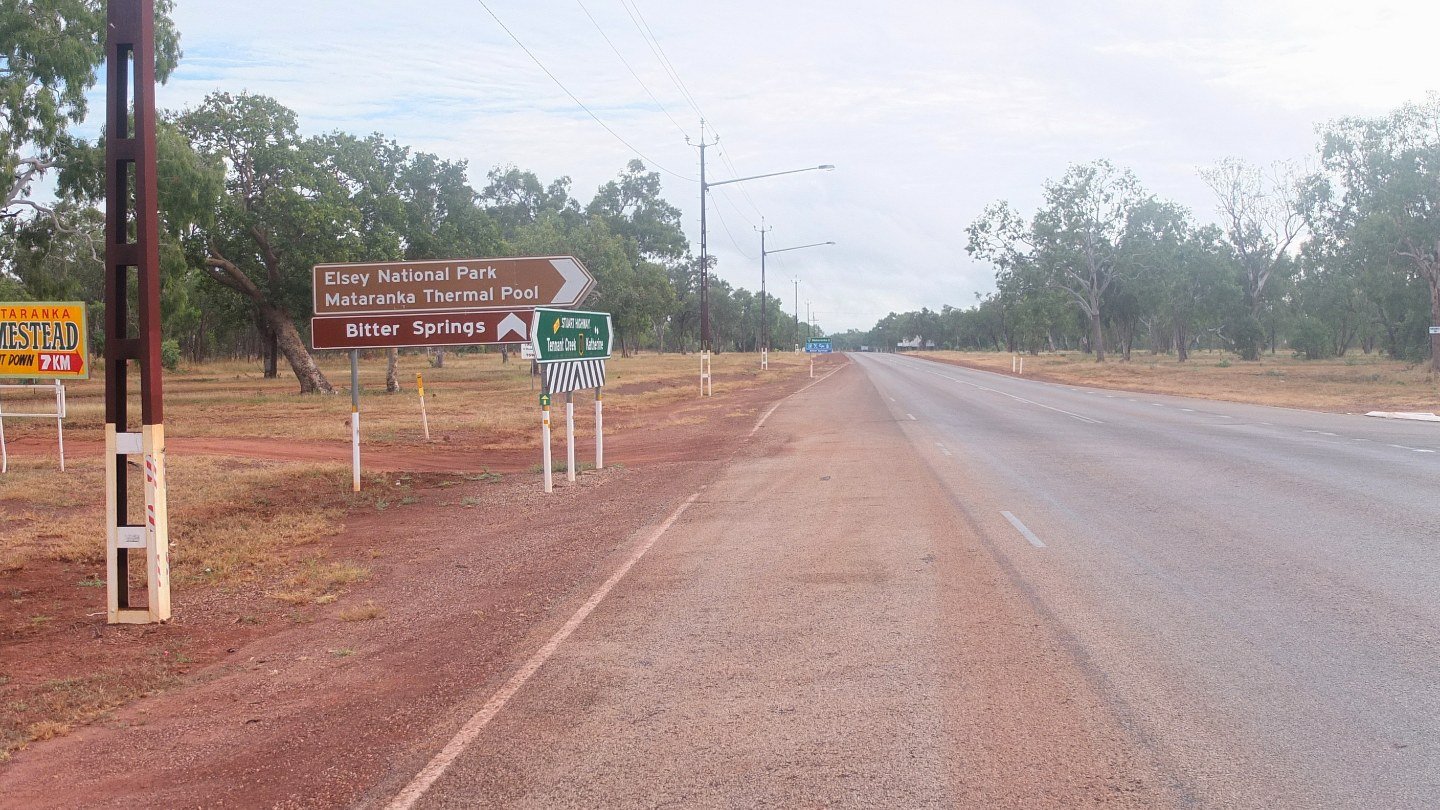 Let’s come back in time, a the Warloch rest area. As I mentioned, it did rain last night but nothing to worried about. The problem now is that it’s bloddy hot at night and I find hard to sleep like this. The mosquitos are back as well so I can’t leave the tent open. Hard life though ;-) Well, I’ve packed everything and I ready to cycle these tiny 26km to get to Mataranka.