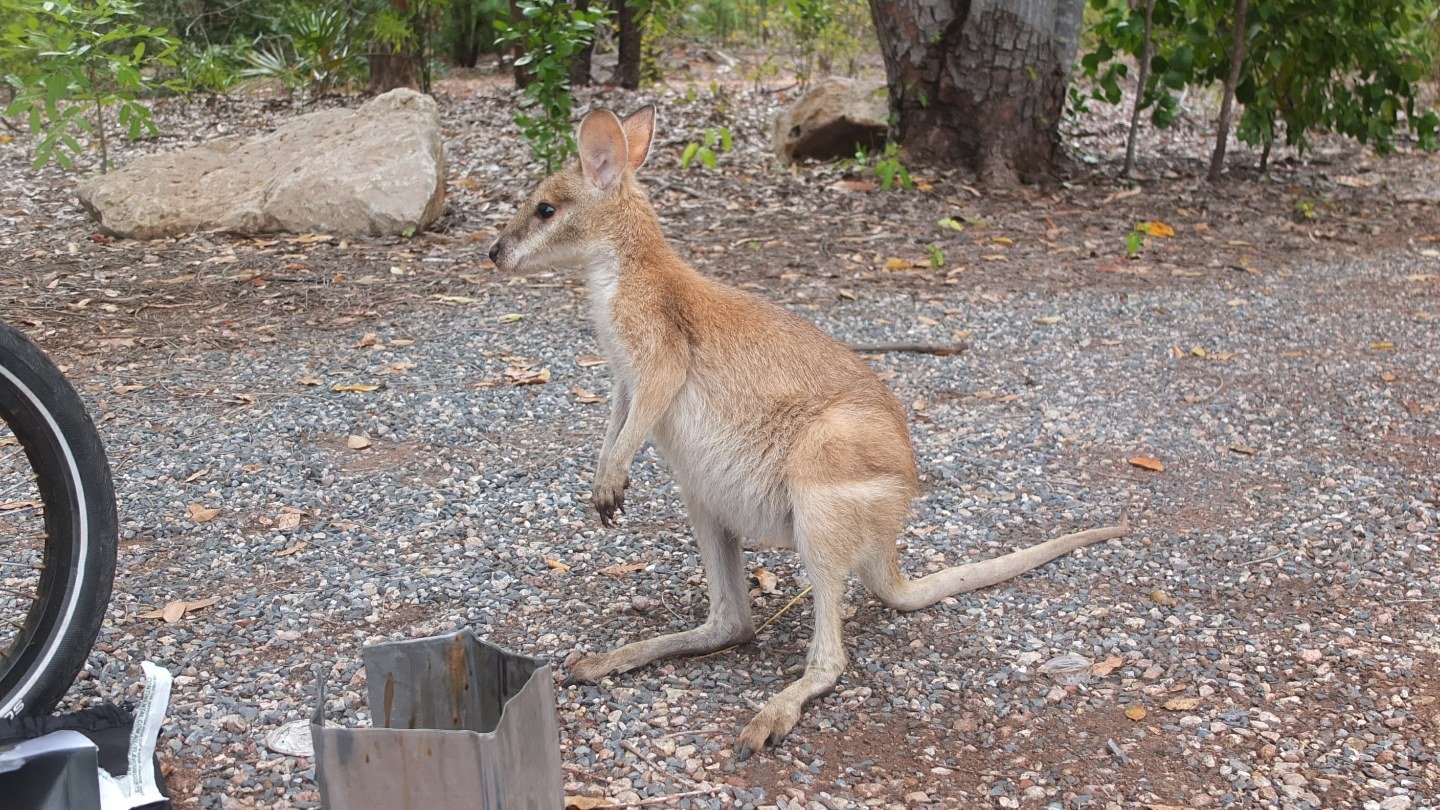 I’m out of the campsite, having lunch on the carpark when that dude came out from the bush, looking for food.