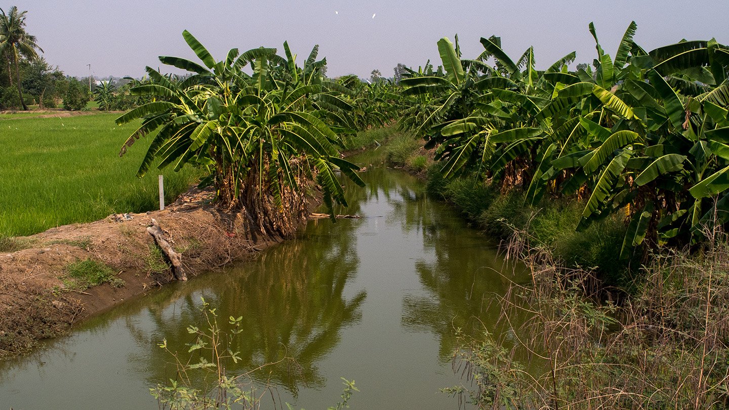 Tiny river surrounded by banana trees.