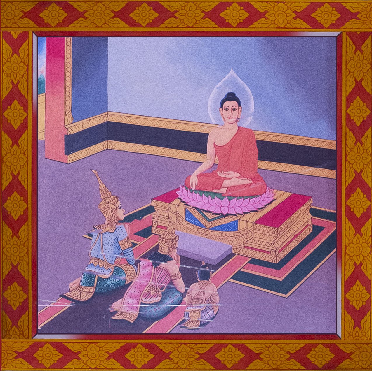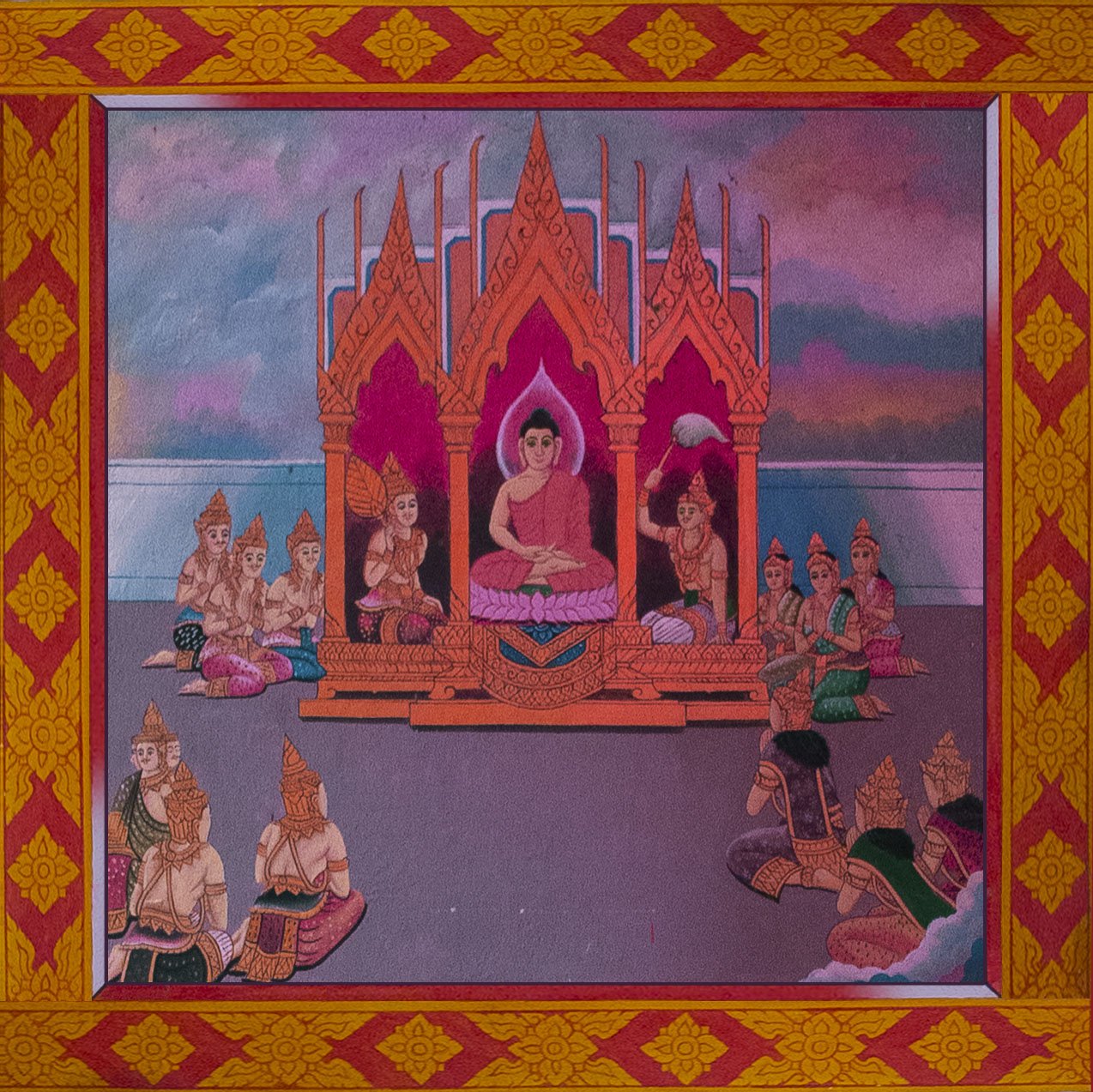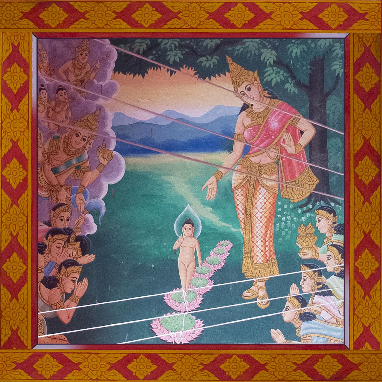 We now entered in the temple where Buddha is standing. On the walls, there is the story of Buddha. I’ve used totoshop to make everything flat again and in order. The white lines onto certain picture is coming from the ropes suspended in the temple. They are used to scare the birds. That’s not the most important actually so let’s start the story of Buddha.