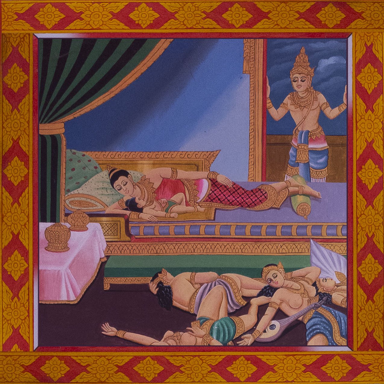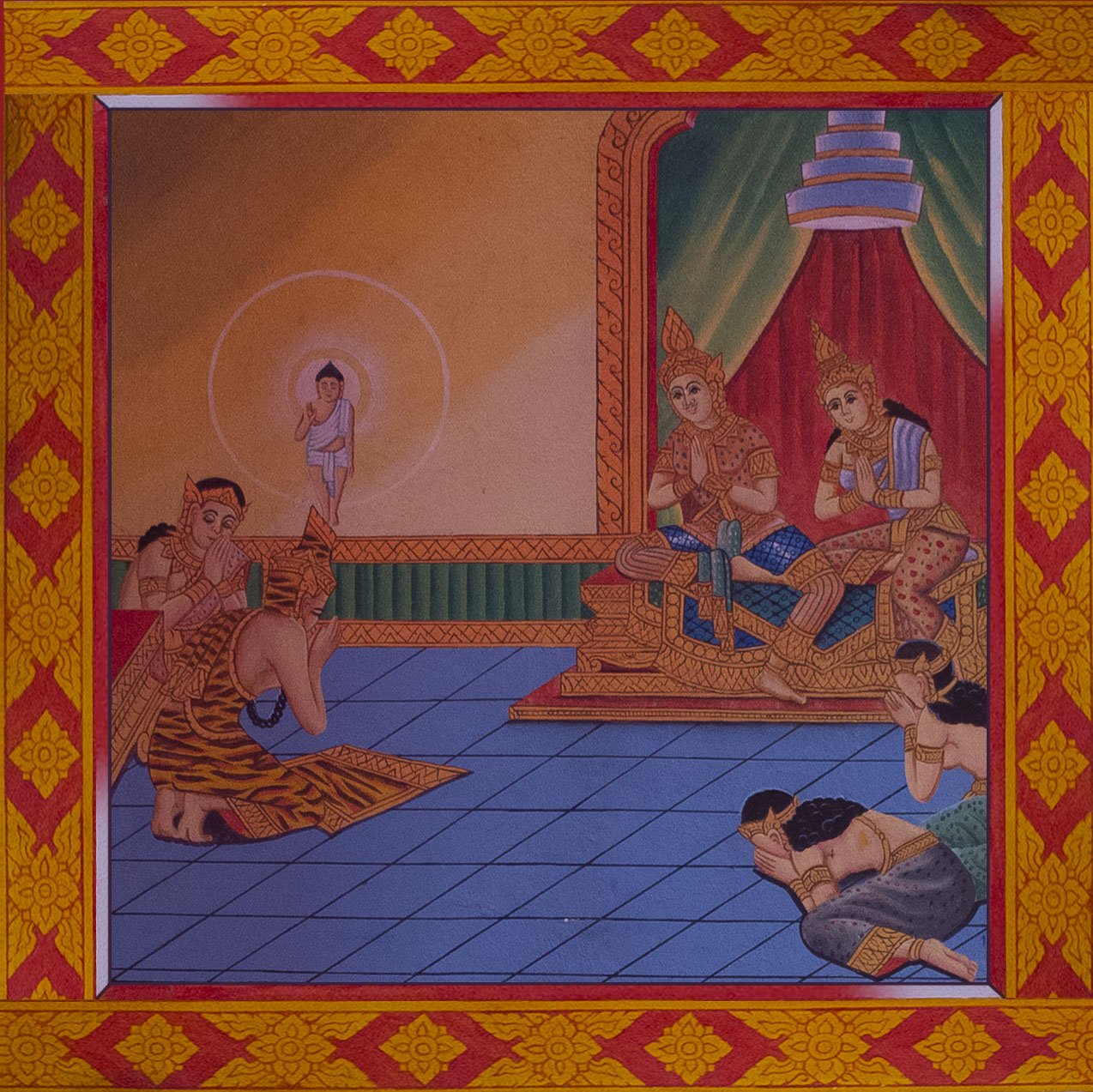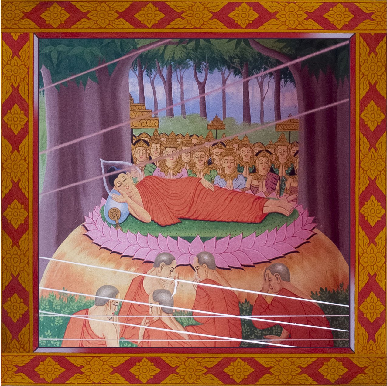 We now entered in the temple where Buddha is standing. On the walls, there is the story of Buddha. I’ve used totoshop to make everything flat again and in order. The white lines onto certain picture is coming from the ropes suspended in the temple. They are used to scare the birds. That’s not the most important actually so let’s start the story of Buddha.