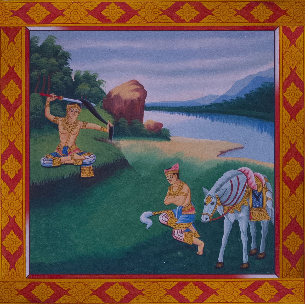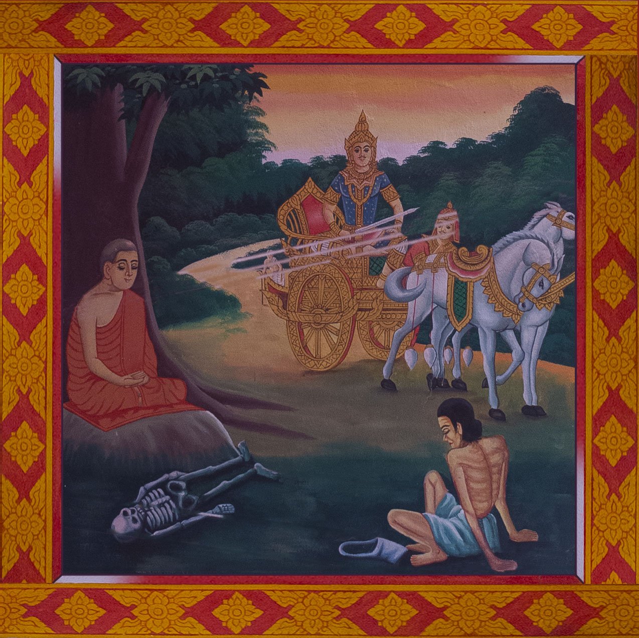 Once a while, when Siddhārtha would go around his domain and discovered the real world. He would see some poor poeple, some other dead.