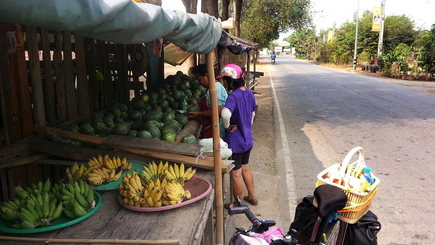 Many fruits merchant stands along the road. Pita bought one watermelon, the women gave her a second one plus a bunch a bananas :-)